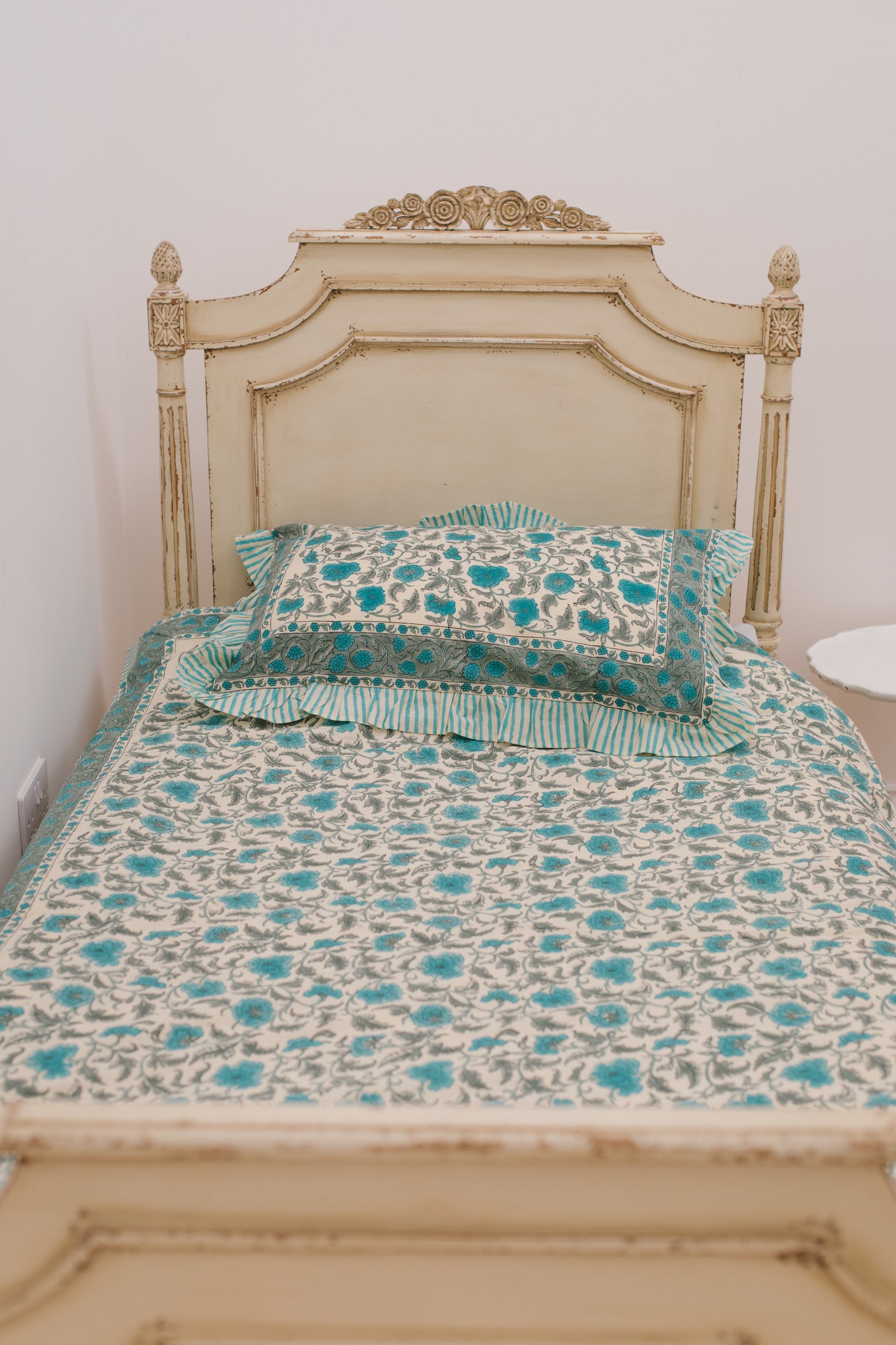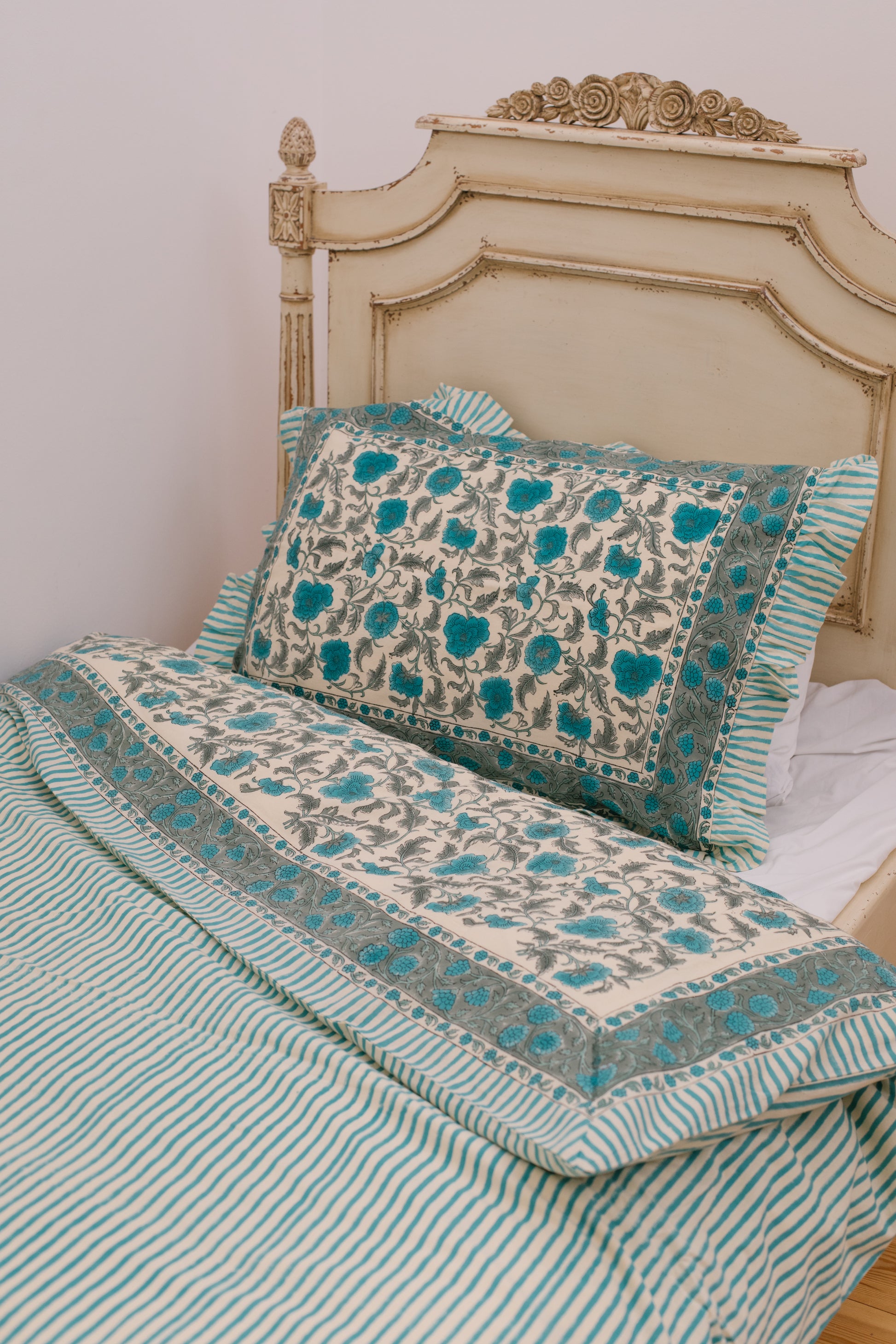 Handmade block printed and reversible - 2 designs in one, vintage blue floral 100% organic cotton duvet set.