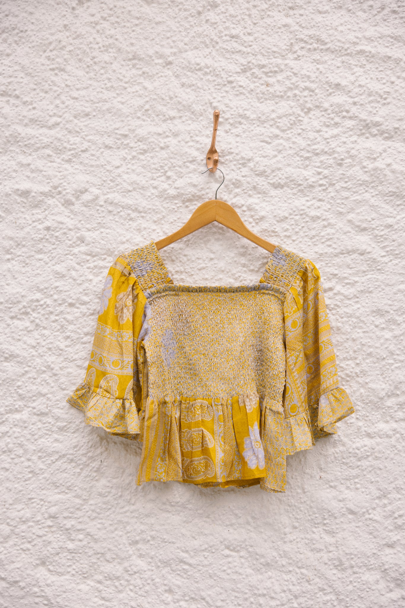 Joelyn is an elegant shirring smock silhouette with year around appeal. She has a smocked bodice, 3/4 length sleeves with a floaty ruffle cuff, a flattering Square neckline front and back with a peplum hem. Joelyn is hand crafted from Vintage up-cycled silk sari's.