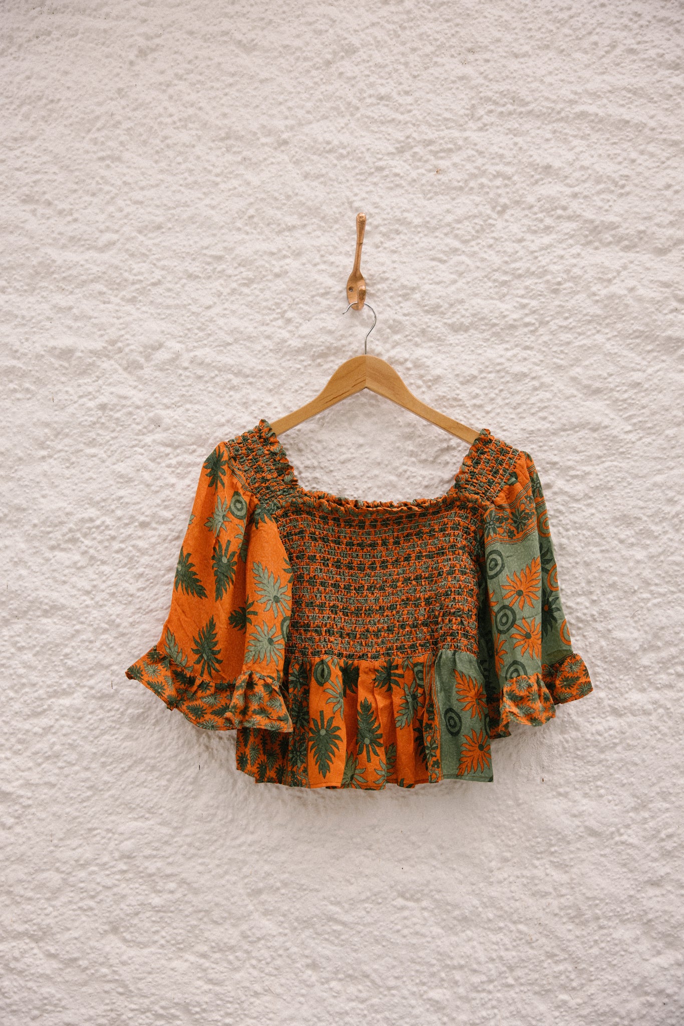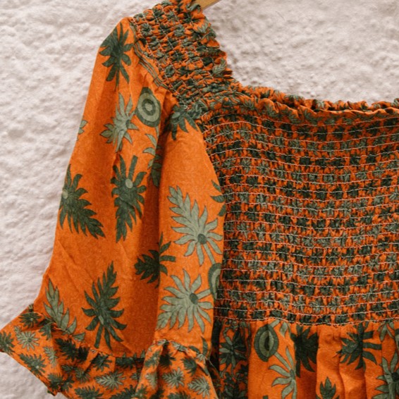 Joelyn is an elegant shirring smock silhouette with year around appeal. She has a smocked bodice, 3/4 length sleeves with a floaty ruffle cuff, a flattering Square neckline front and back with a peplum hem. Joelyn is hand crafted from Vintage up-cycled silk sari's.