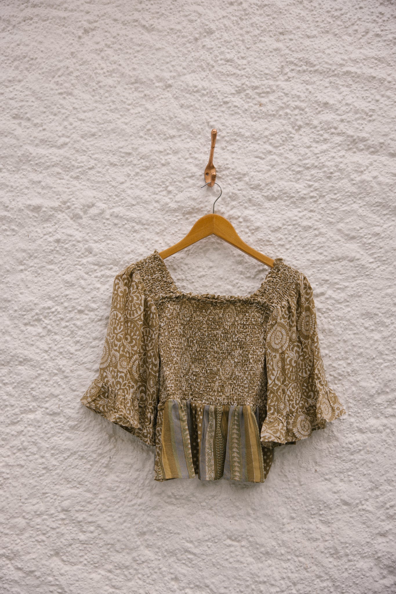 Joelyn is an elegant shirring smock silhouette with year around appeal. She has a smocked bodice, 3/4 length sleeves with a floaty ruffle cuff, a flattering Square neckline front and back with a peplum hem. Joelyn is hand crafted from Vintage up-cycled silk sari's.