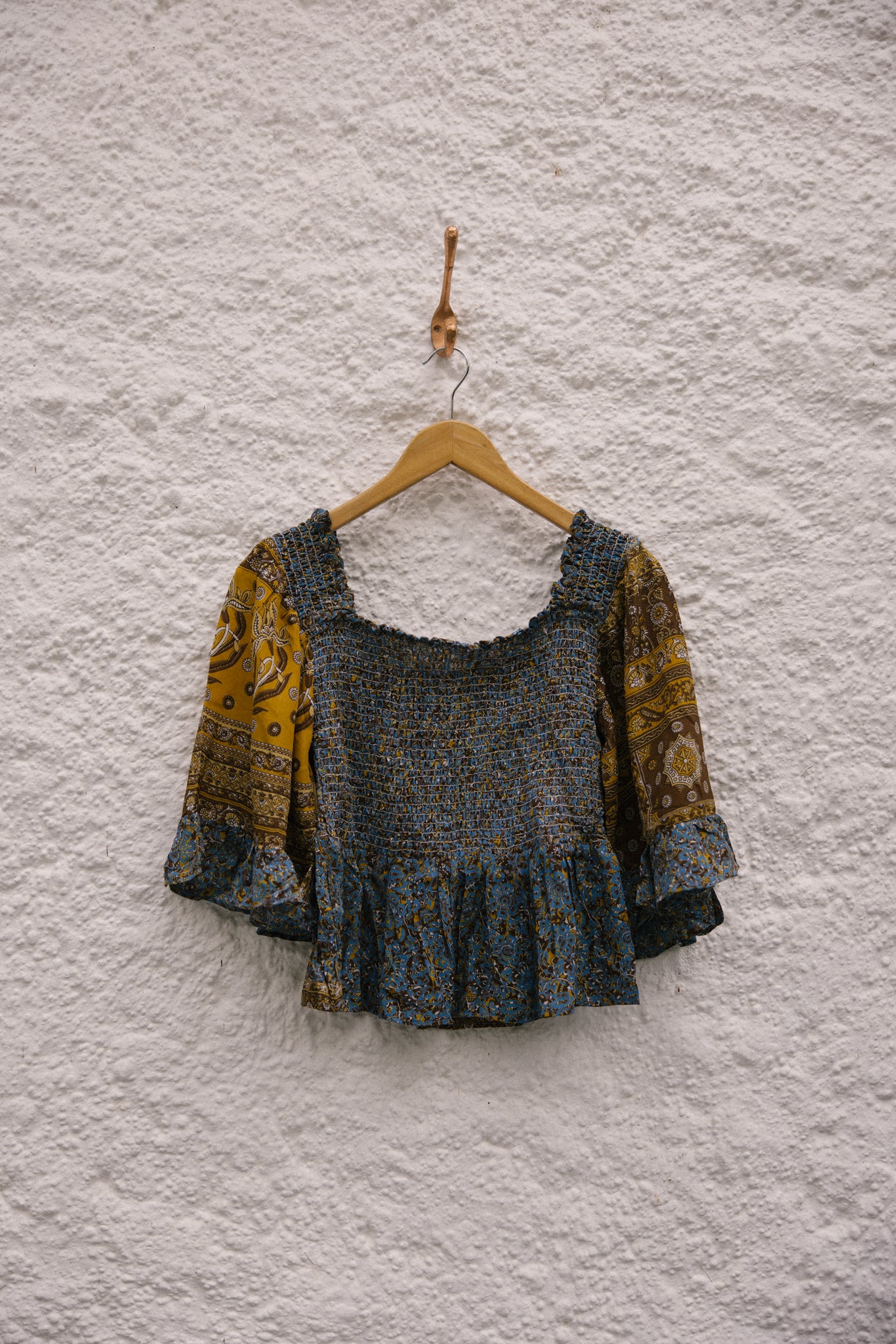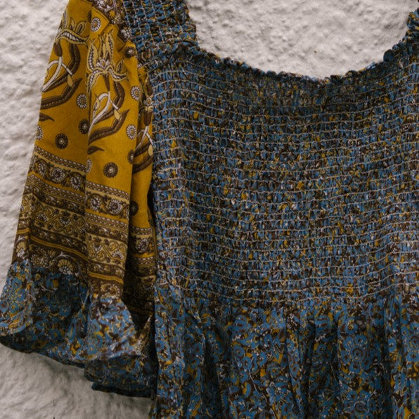Joelyn is an elegant shirring smock silhouette with year around appeal. She has a smocked bodice, 3/4 length sleeves with a floaty ruffle cuff, a flattering Square neckline front and back with a peplum hem. Joelyn is hand crafted from Vintage up-cycled silk sari's.