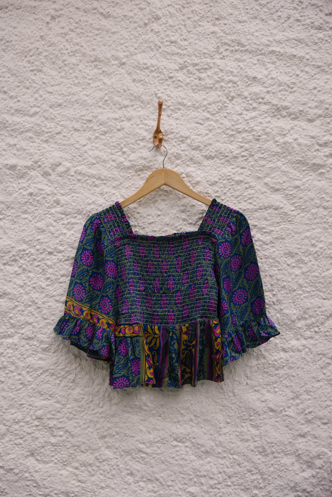 Joelyn is an elegant shirring smock silhouette with year around appeal. She has a smocked bodice, 3/4 length sleeves with a floaty ruffle cuff, a flattering Square neckline front and back with a peplum hem. Joelyn is hand crafted from Vintage up-cycled silk sari's.