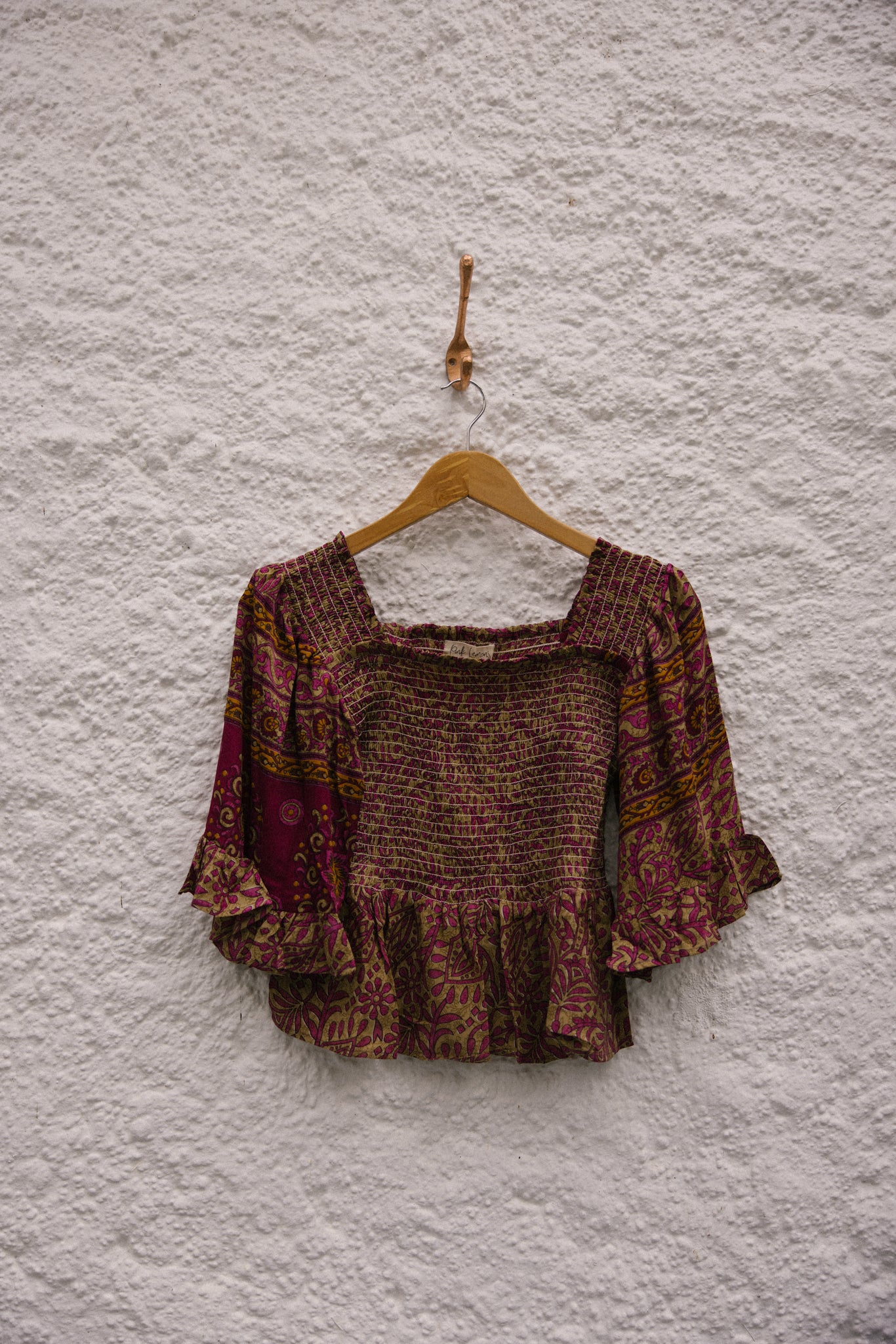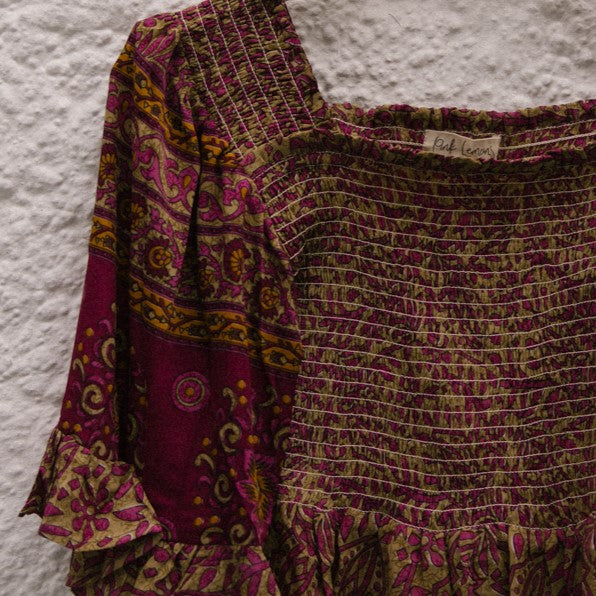 Joelyn is an elegant shirring smock silhouette with year around appeal. She has a smocked bodice, 3/4 length sleeves with a floaty ruffle cuff, a flattering Square neckline front and back with a peplum hem. Joelyn is hand crafted from Vintage up-cycled silk sari's.