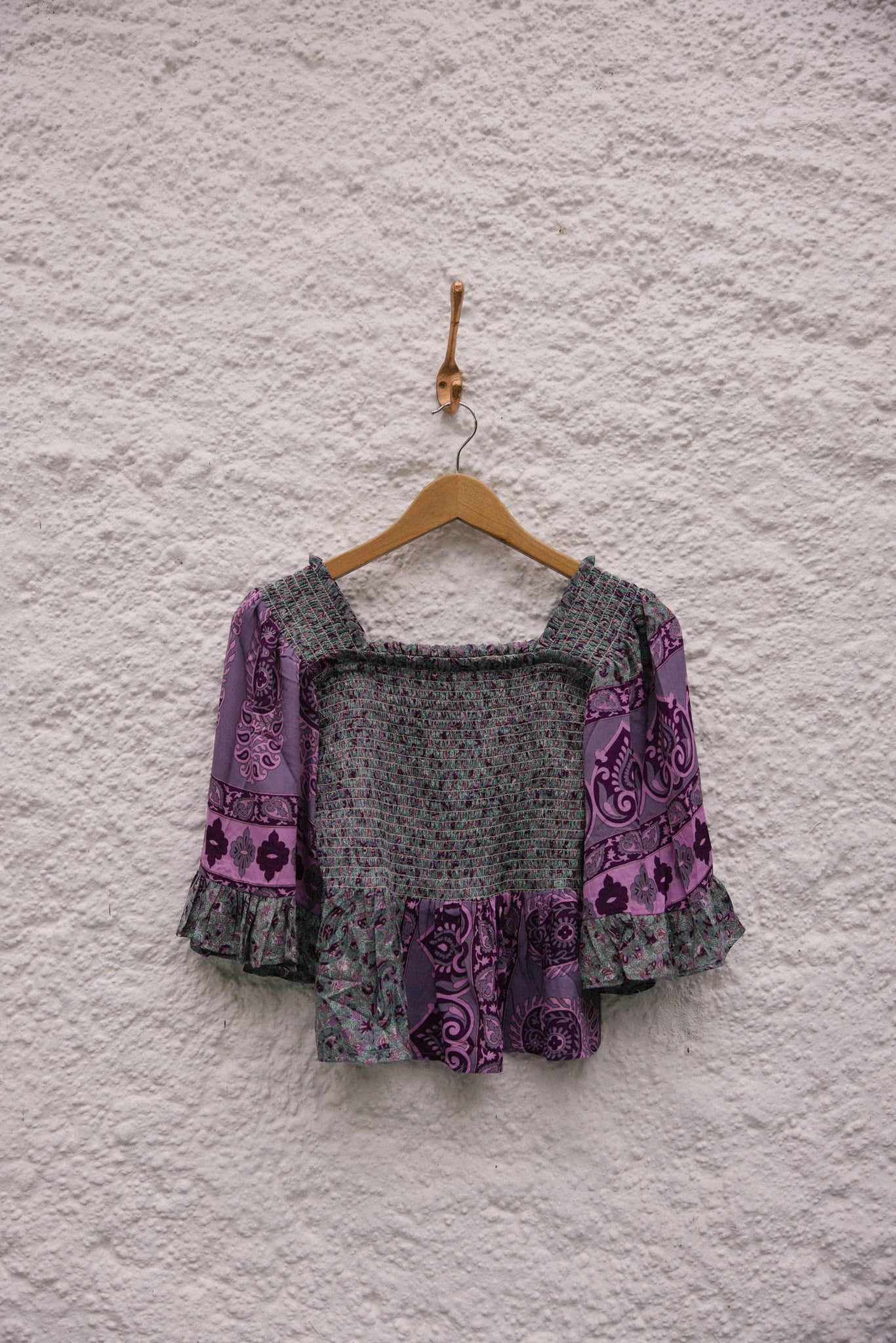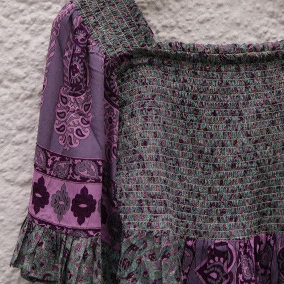 Joelyn is an elegant shirring smock silhouette with year around appeal. She has a smocked bodice, 3/4 length sleeves with a floaty ruffle cuff, a flattering Square neckline front and back with a peplum hem. Joelyn is hand crafted from Vintage up-cycled silk sari's.