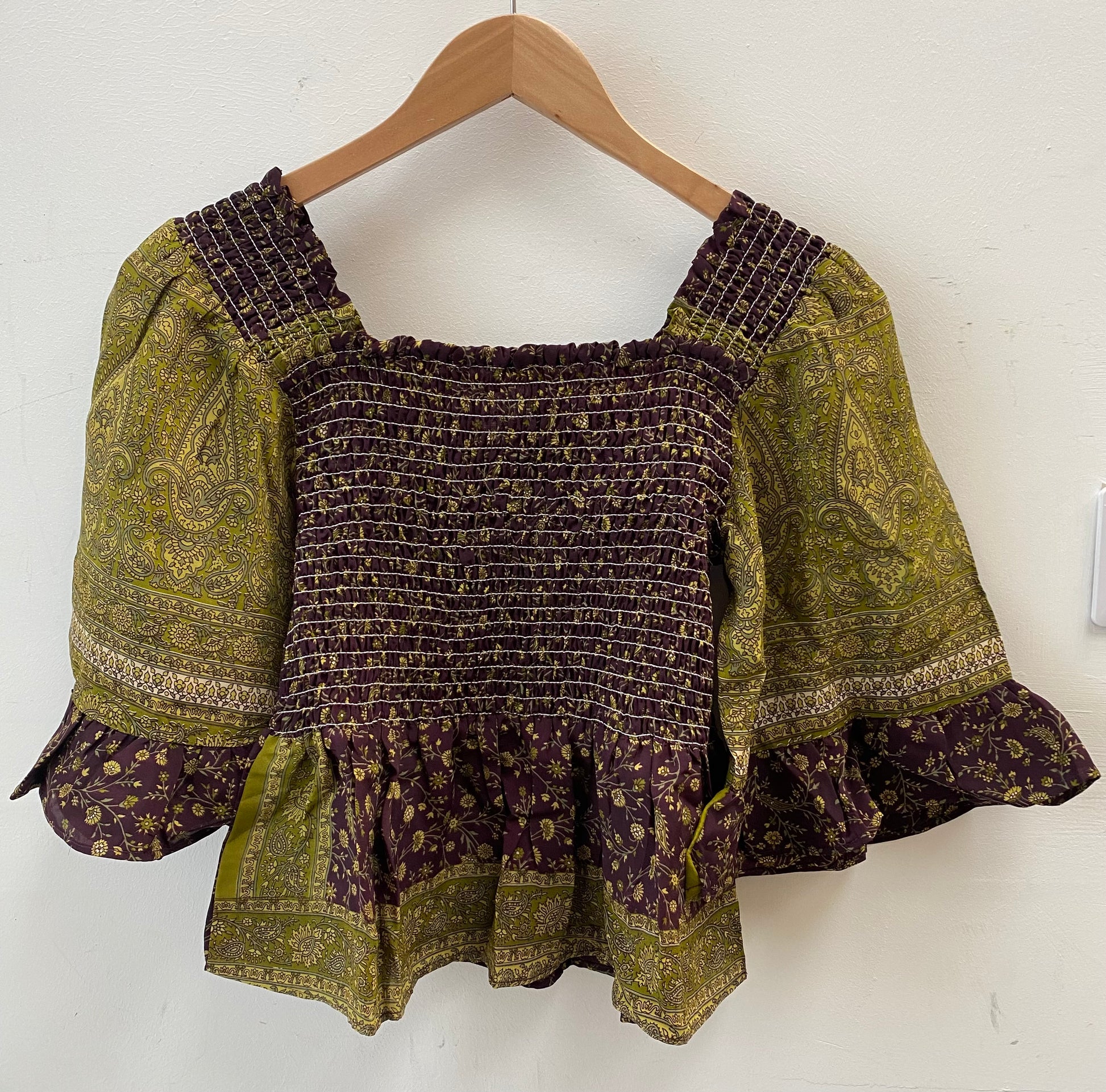 Joelyn is an elegant shirring smock silhouette with year around appeal. She has a smocked bodice, 3/4 length sleeves with a floaty ruffle cuff, a flattering Square neckline front and back with a peplum hem. Joelyn is hand crafted from Vintage up-cycled silk sari's.