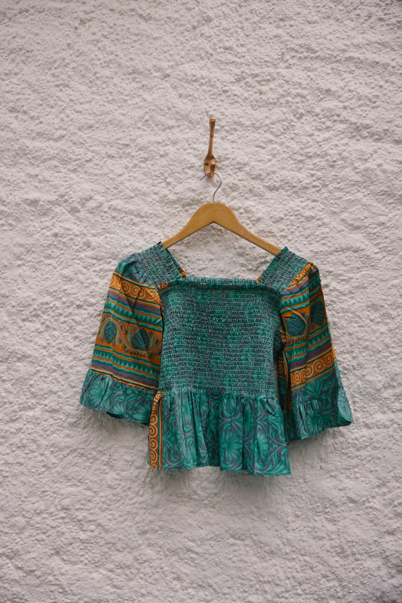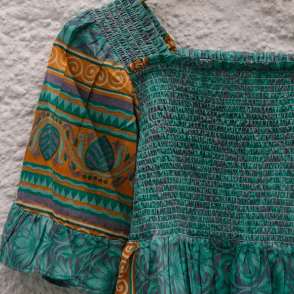 Joelyn is an elegant shirring smock silhouette with year around appeal. She has a smocked bodice, 3/4 length sleeves with a floaty ruffle cuff, a flattering Square neckline front and back with a peplum hem. Joelyn is hand crafted from Vintage up-cycled silk sari's.