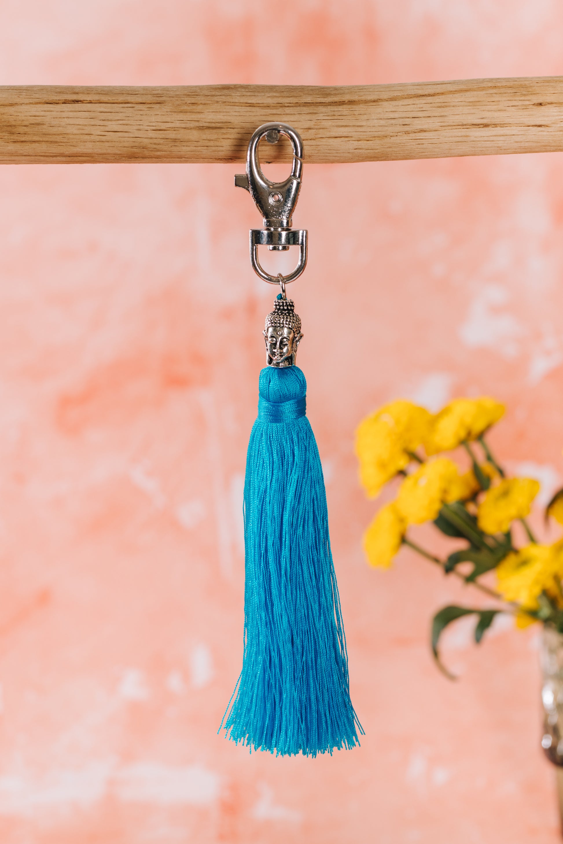 Buddha head detailed keyring with teal tassel.