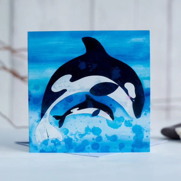Take a leap of faith, with this greetings card designed by Joanne Wishart, featuring an Orca and its pup leaping through the ocean. The perfect card for someone making a change in their life.