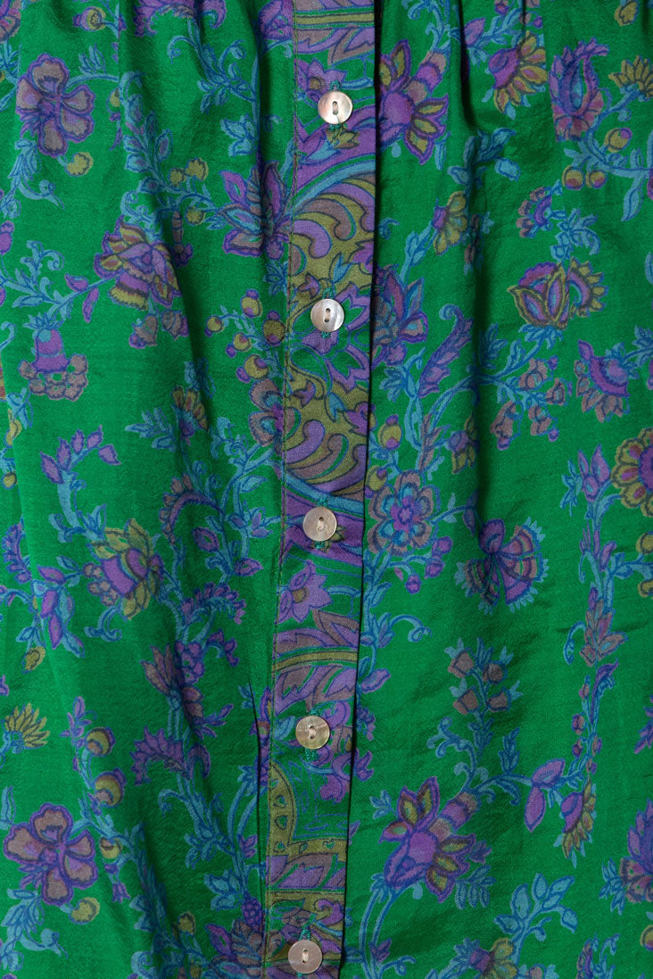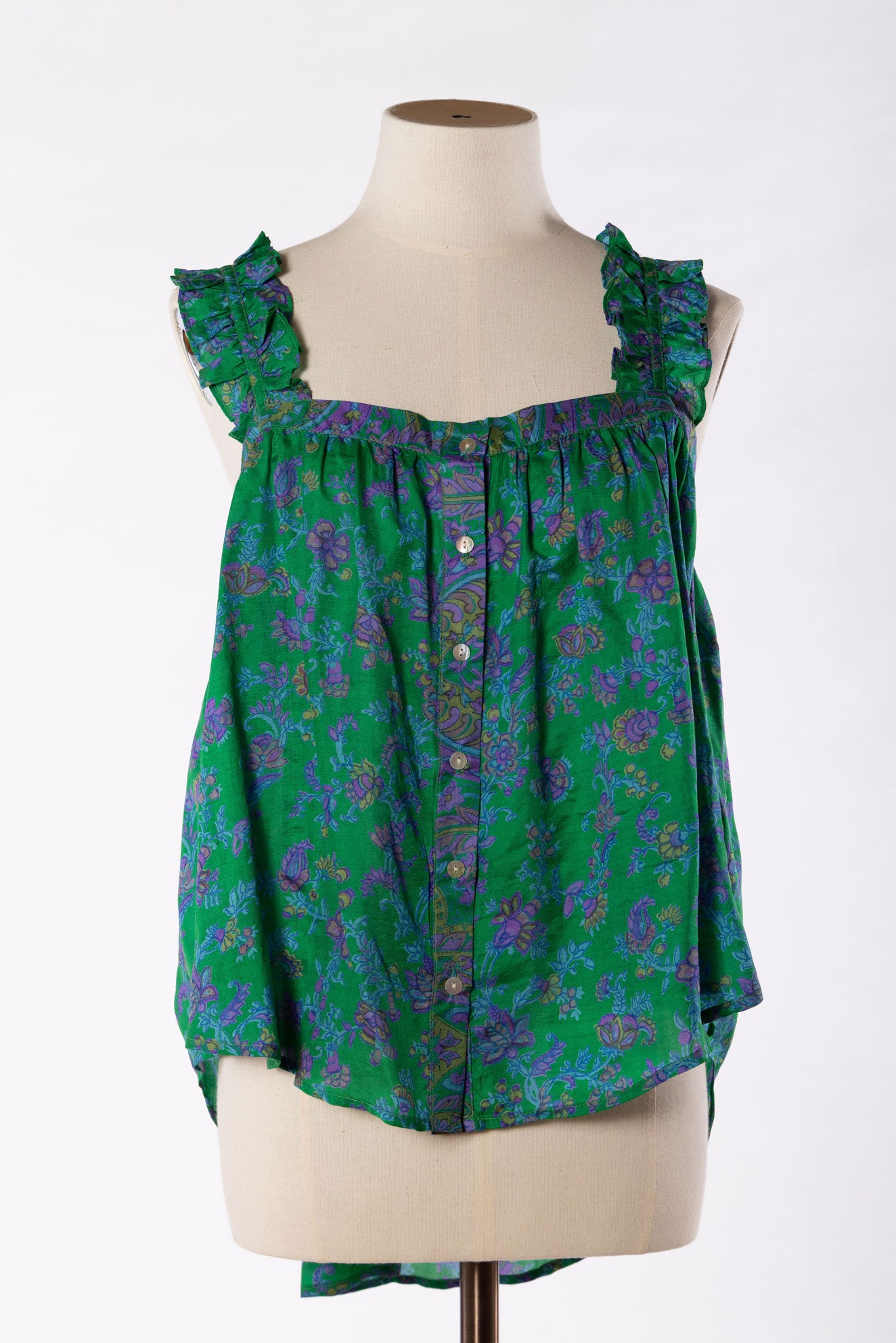 Lilly is the prettiest of camisoles made in pure vintage silk from up-cycled vintage sari’s. Designed for a loose fit. She has delicate ruffle strap details with adjustable metal attachments at the back, with mother of pearl buttons running down the front. This camisole is ideal for layering, it has a gentle flared hem, with a dropped them hem on the back which creates a relaxed look but also gives it a elegant touch. Wear yours with jeans, skirts, shorts, the style ways are endless. Lilly can be worn casually or dressed up with jewels for a night out.