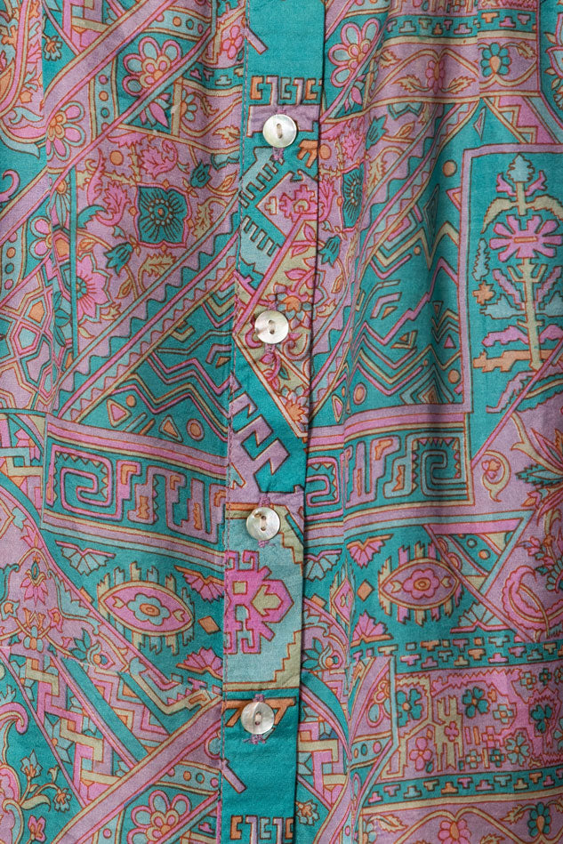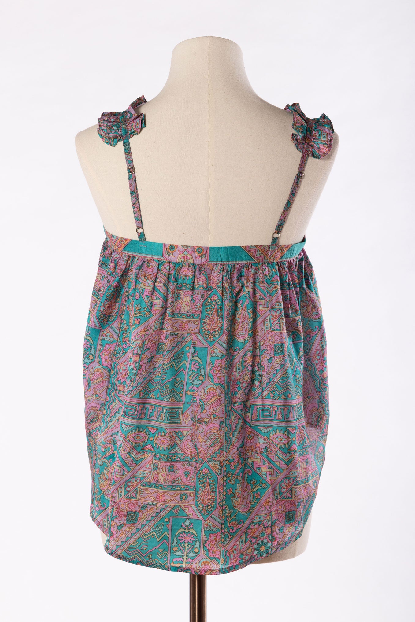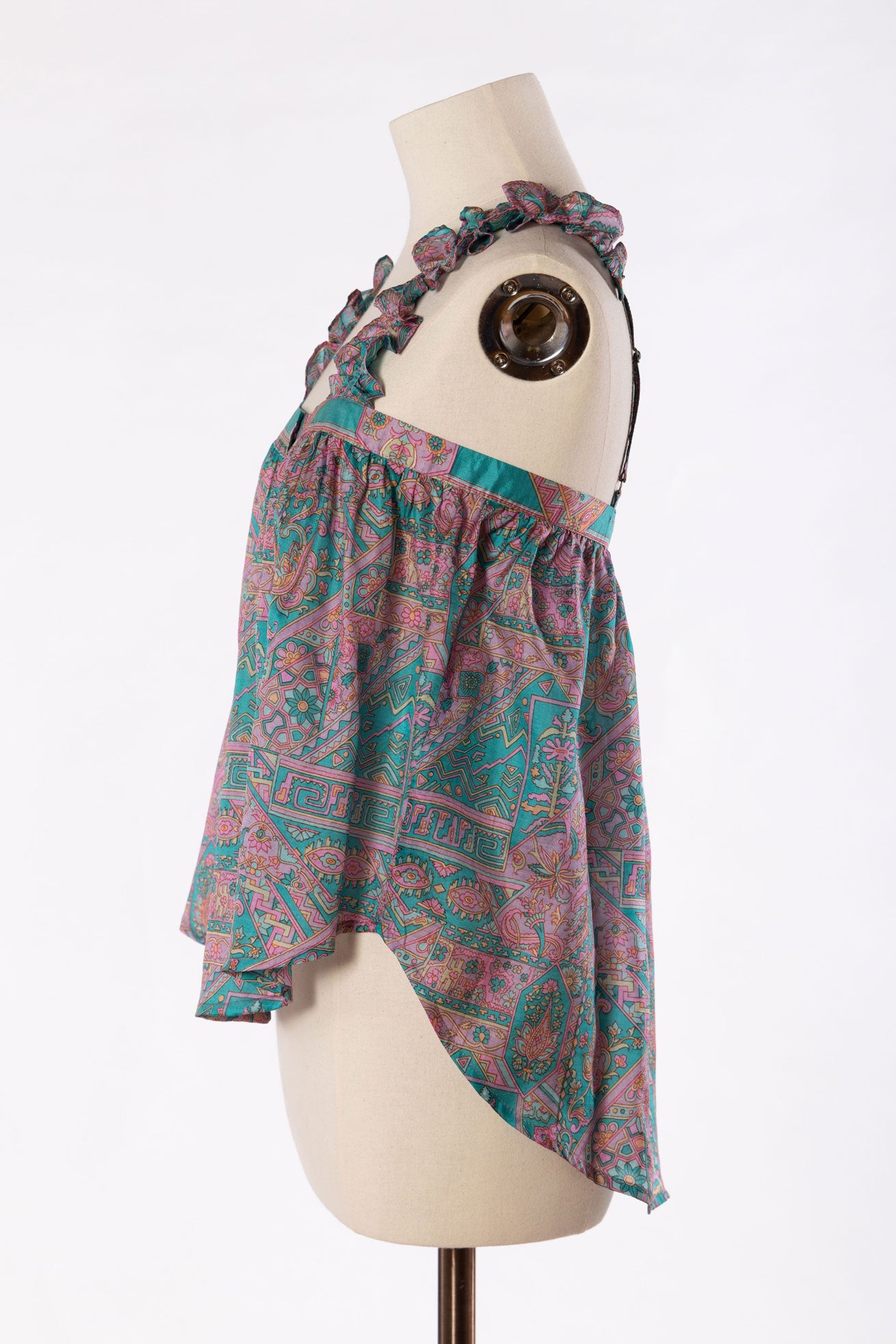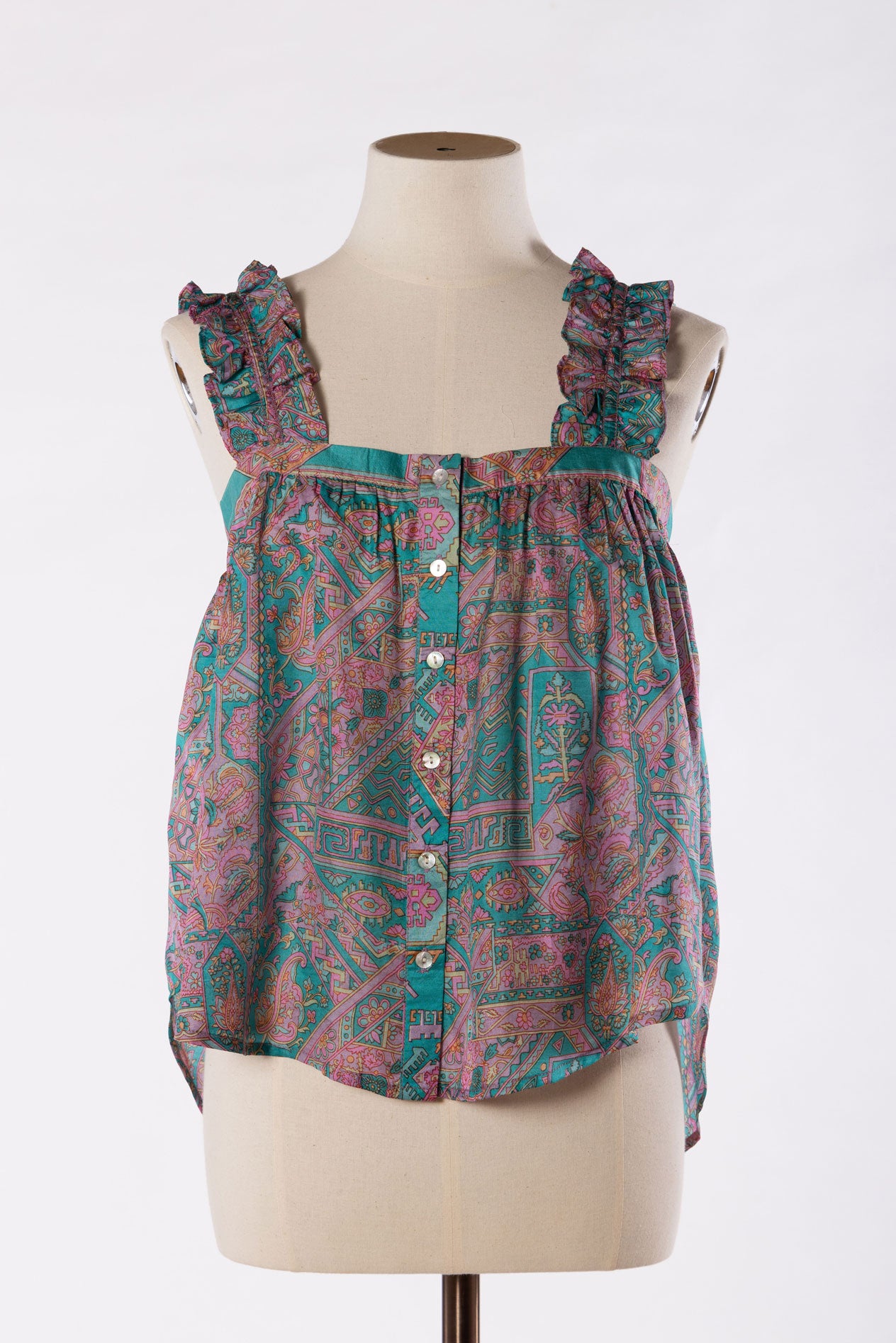 Lilly is the prettiest of camisoles made in pure vintage silk from up-cycled vintage sari’s. Designed for a loose fit. She has delicate ruffle strap details with adjustable metal attachments at the back, with mother of pearl buttons running down the front. This camisole is ideal for layering, it has a gentle flared hem, with a dropped them hem on the back which creates a relaxed look but also gives it a elegant touch. Wear yours with jeans, skirts, shorts, the style ways are endless. Lilly can be worn casually or dressed up with jewels for a night out .