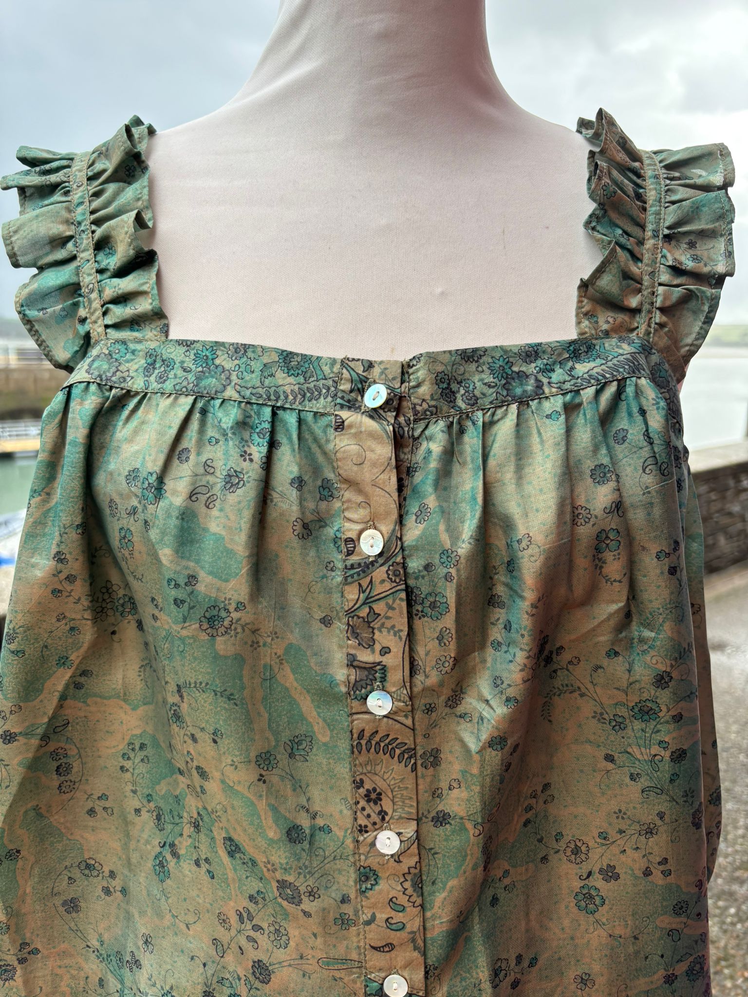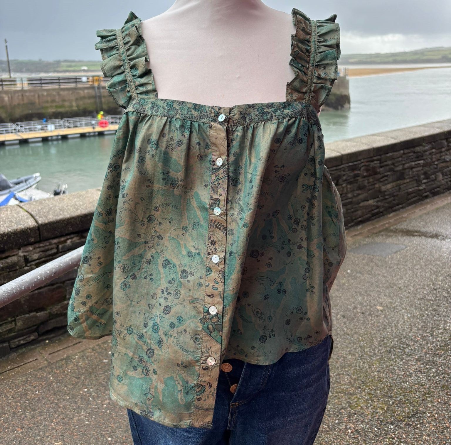 Lilly is the prettiest of camisoles made in pure vintage silk from up-cycled vintage sari’s. Designed for a loose fit. She has delicate ruffle strap details with adjustable metal attachments at the back, with mother of pearl buttons running down the front. This camisole is ideal for layering, it has a gentle flared hem, with a dropped them hem on the back which creates a relaxed look but also gives it a elegant touch. Wear yours with jeans, skirts, shorts, the style ways are endless. Lilly can be worn casually or dressed up with jewels for a night out .