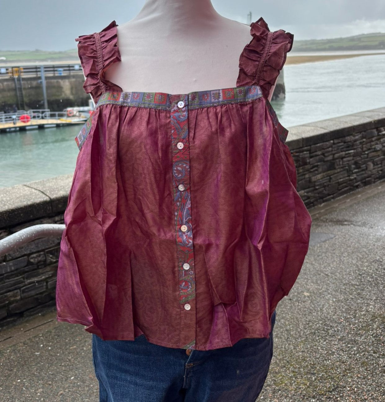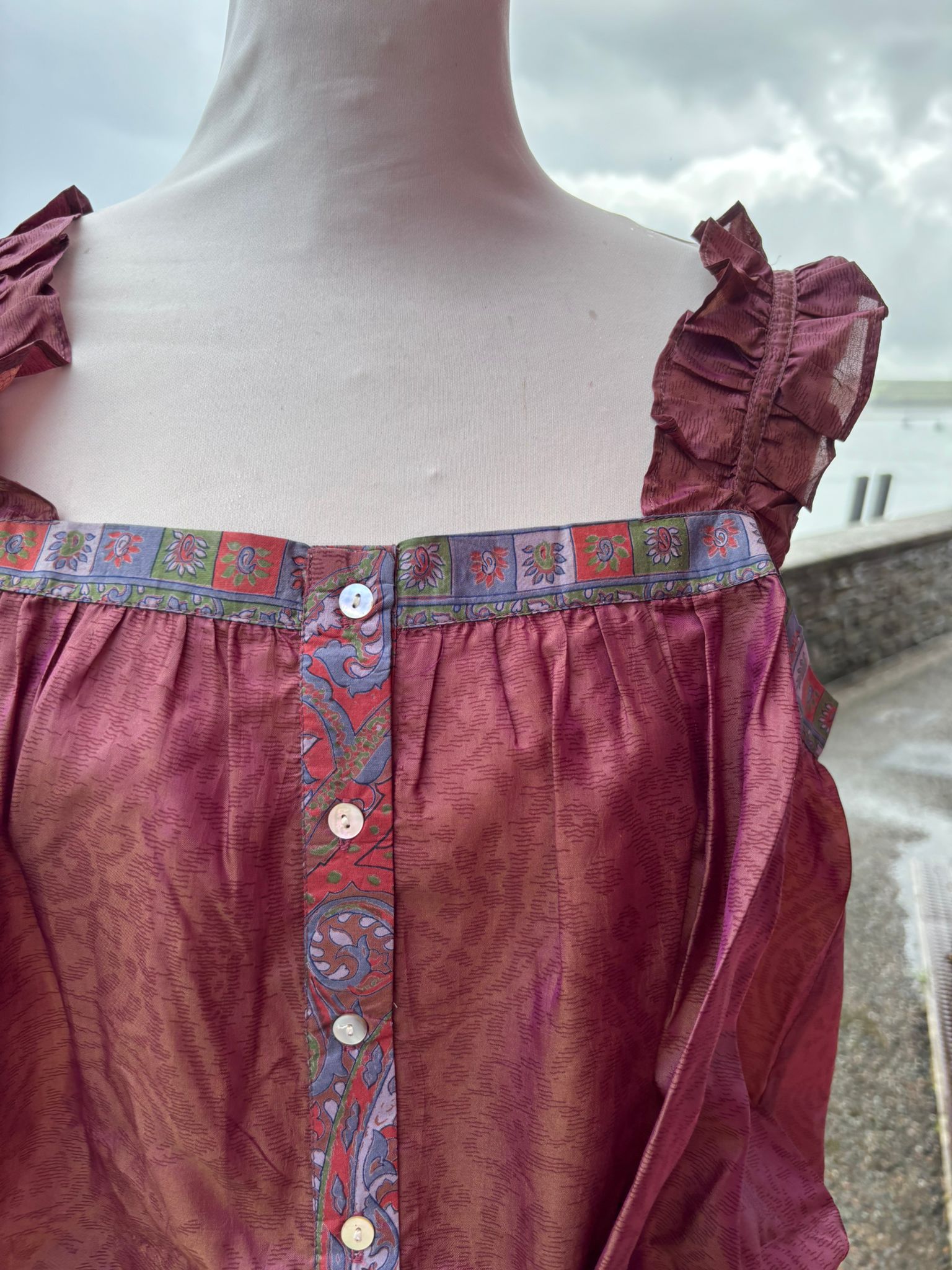 Lilly is the prettiest of camisoles made in pure vintage silk from up-cycled vintage sari’s. Designed for a loose fit. She has delicate ruffle strap details with adjustable metal attachments at the back, with mother of pearl buttons running down the front. This camisole is ideal for layering, it has a gentle flared hem, with a dropped them hem on the back which creates a relaxed look but also gives it a elegant touch. Wear yours with jeans, skirts, shorts, the style ways are endless. Lilly can be worn casually or dressed up with jewels for a night out .