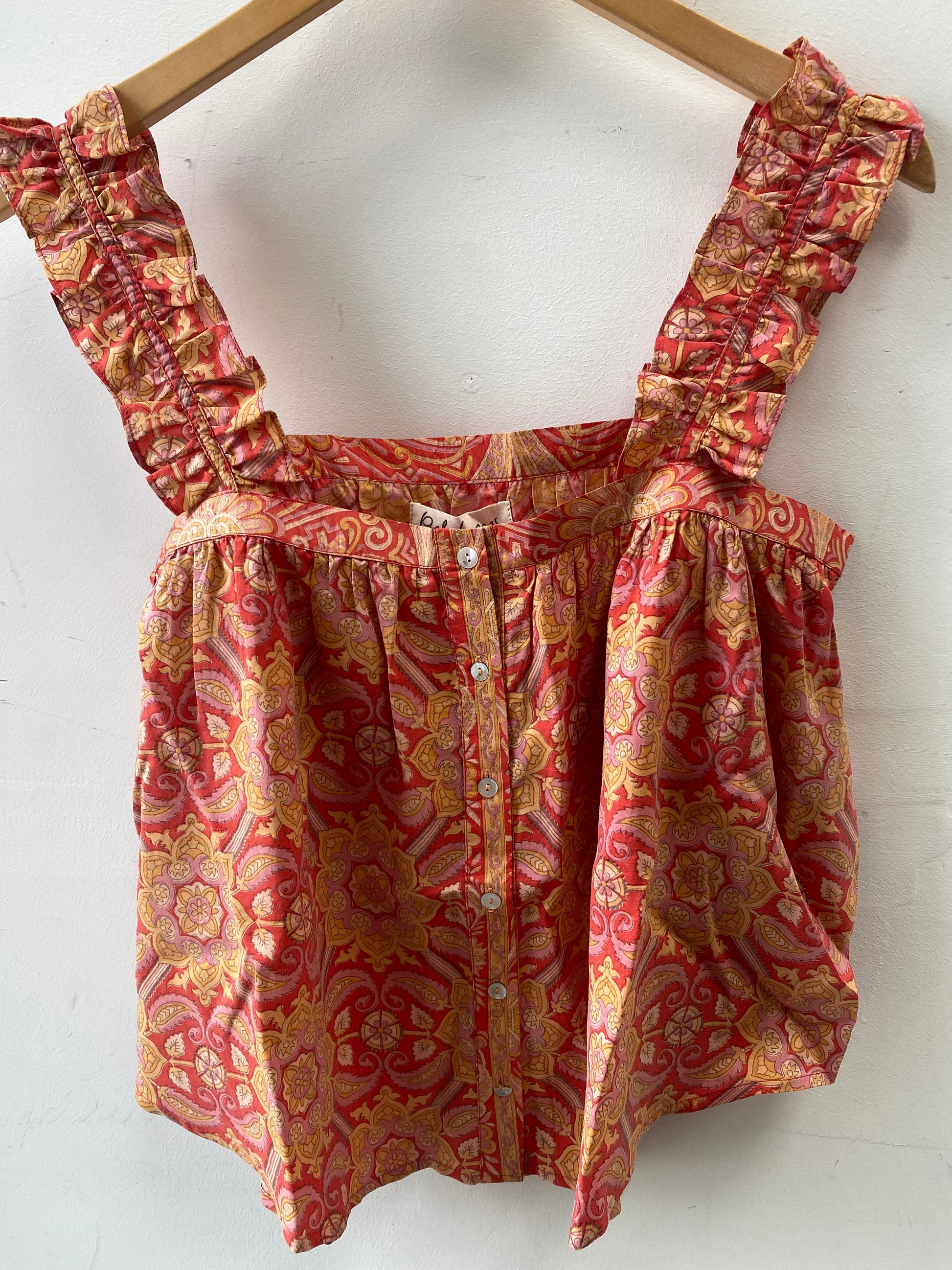 Lilly is the prettiest of camisoles made in pure vintage silk from up-cycled vintage sari’s. Designed for a loose fit. She has delicate ruffle strap details with adjustable metal attachments at the back, with mother of pearl buttons running down the front. This camisole is ideal for layering, it has a gentle flared hem, with a dropped them hem on the back which creates a relaxed look but also gives it a elegant touch. Wear yours with jeans, skirts, shorts, the style ways are endless. Lilly can be worn casually or dressed up with jewels for a night out .