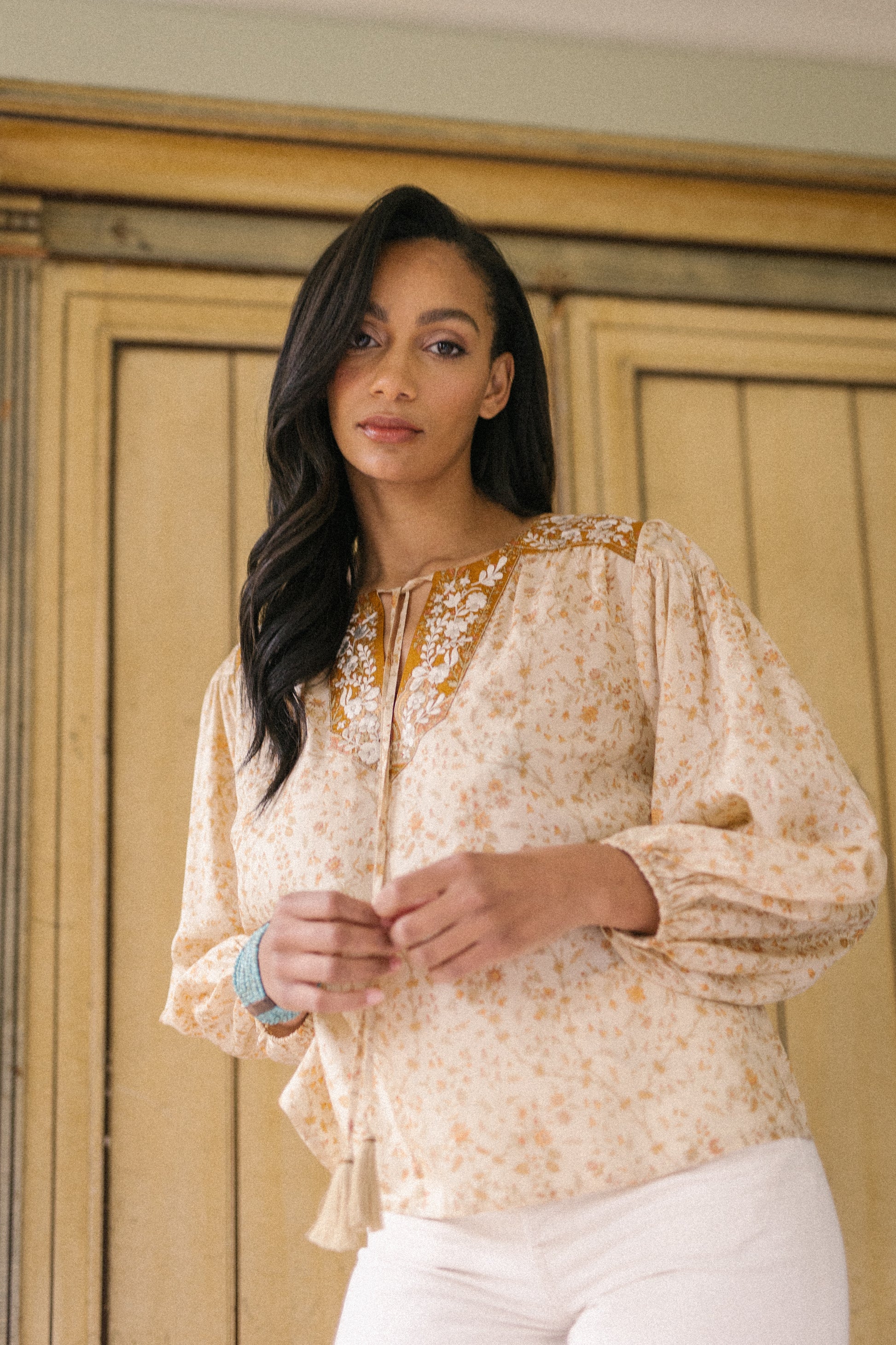 Lolita blouse has a loose breezy, feminine shape with puff shoulder detail and a front yoke with tassel ties. Lolita exudes charm and elegance with pretty embroidery detail on the shoulders and front yoke ,she looks great with jeans , linen pants and skirts /shorts alike , she can be dressed up or down to suit the occasion. It has a swing shape that can be worn loose or tucked in . Super versatile .