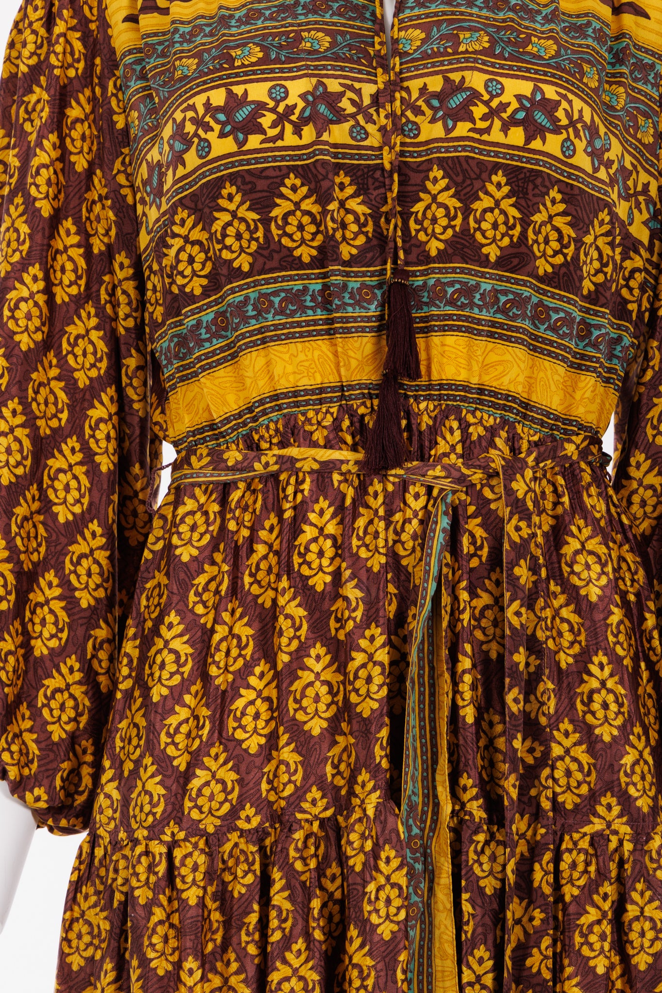 Lola is made from a beautiful upcycled vintage sari , she is super versatile and with year round appeal. Lola is the everyday dress you'll find yourself reaching for time after time , she has feminine blouson sleeves , gentle elasticated waistline with a detachable sash , cinch in the waistline for a neater fit . She has a round neckline with a deep V slit opening and can be fastened with tie bands with tassels at the front . Lola has deep side pockets at the seams.
