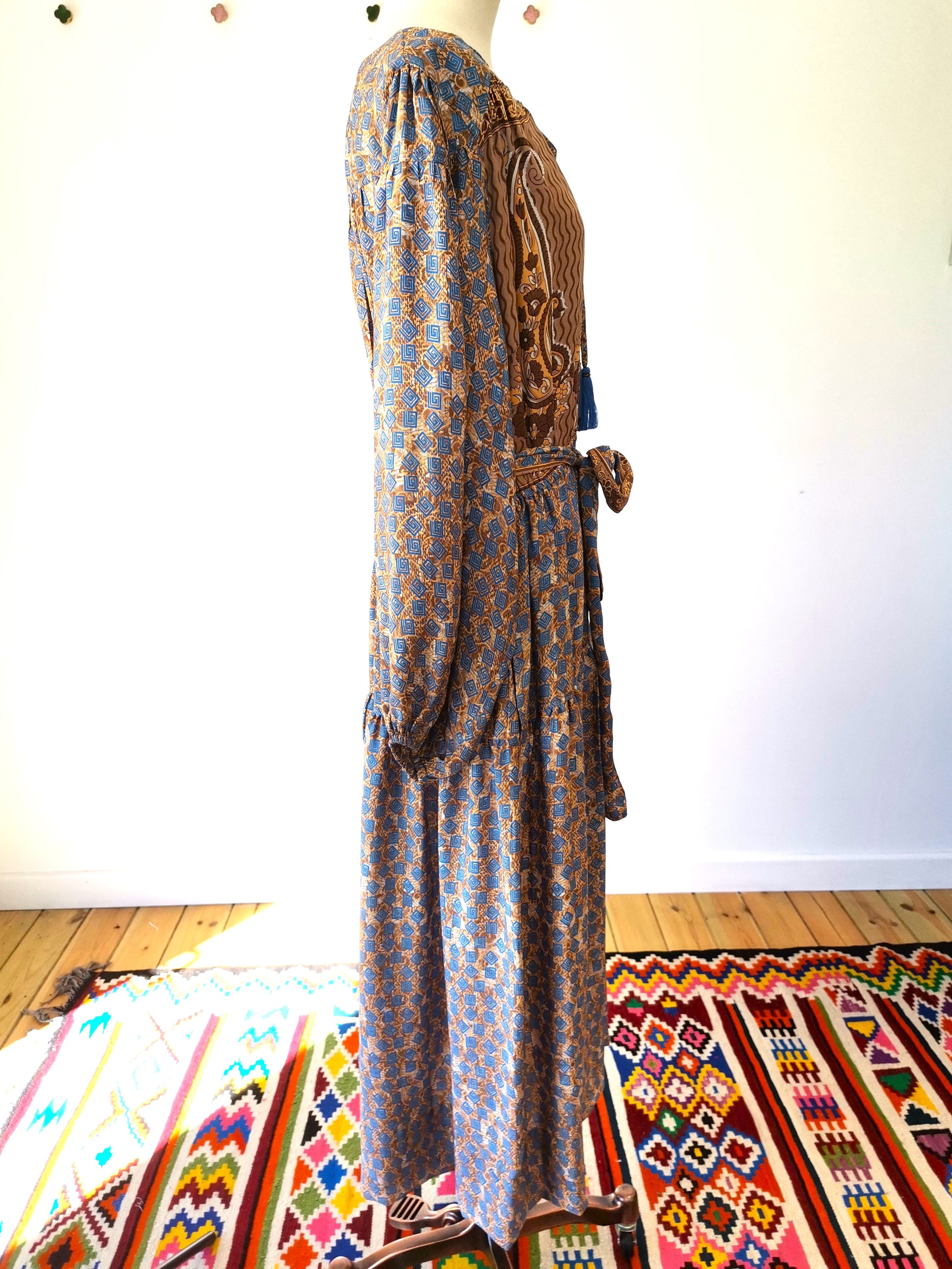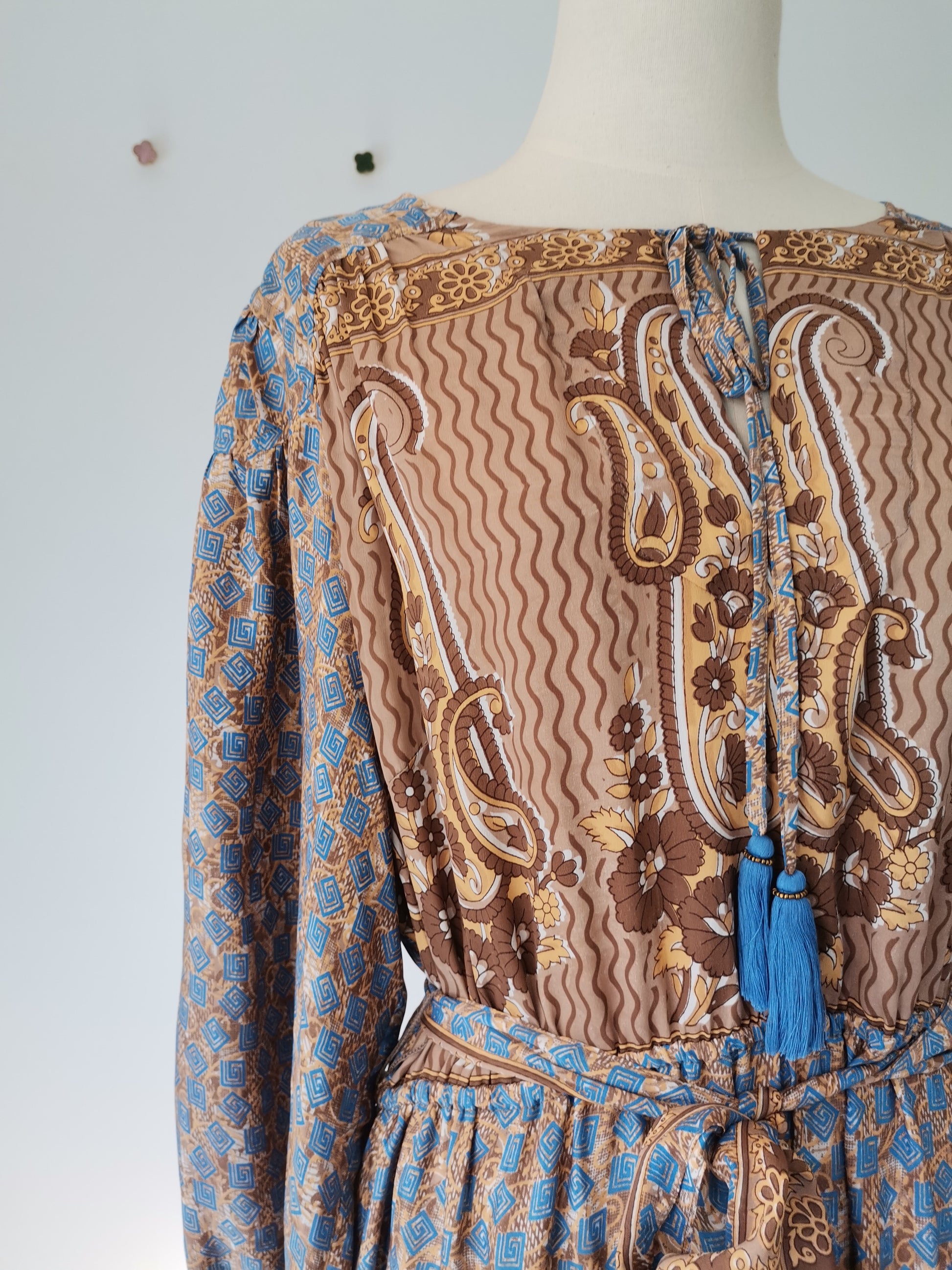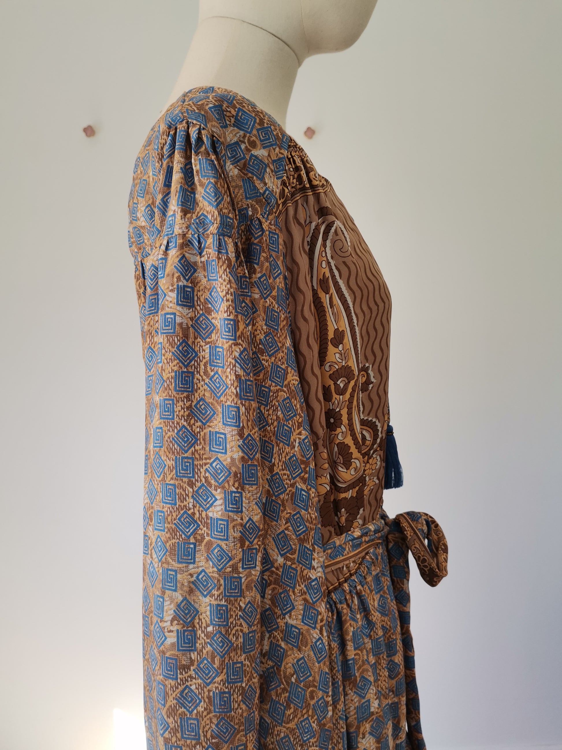 Lola is made from a beautiful upcycled vintage sari, she is super versatile and has year round appeal. Lola is the everyday dress you'll find yourself reaching for time after time, she has feminine blouson sleeves, gentle elasticated waistline with a detachable sash, cinch in the waistline for a neater fit. She has a round neckline with a deep V slit opening and can be fastened with tie bands with tassels at the front. Lola has deep side pockets at the seams.