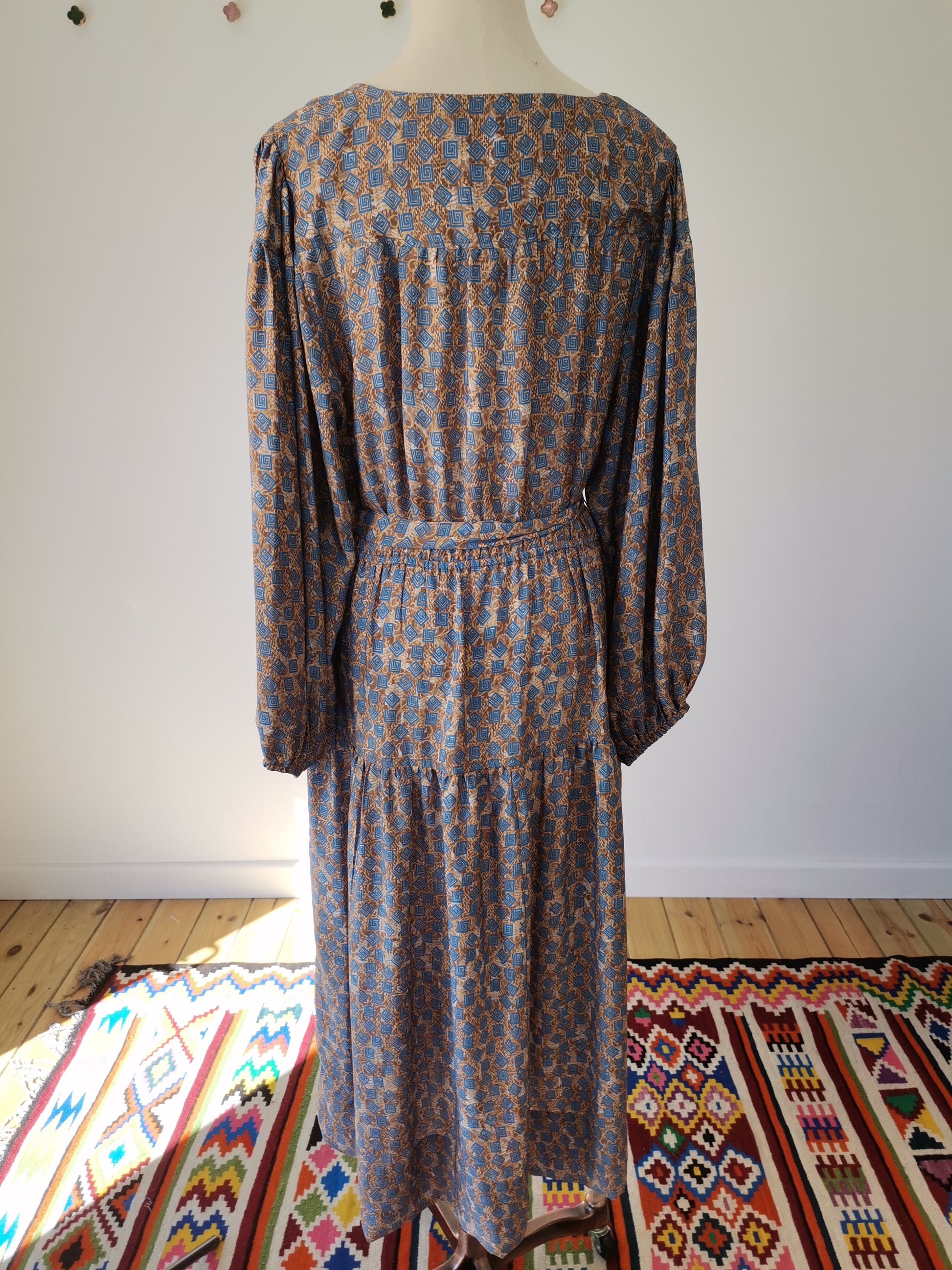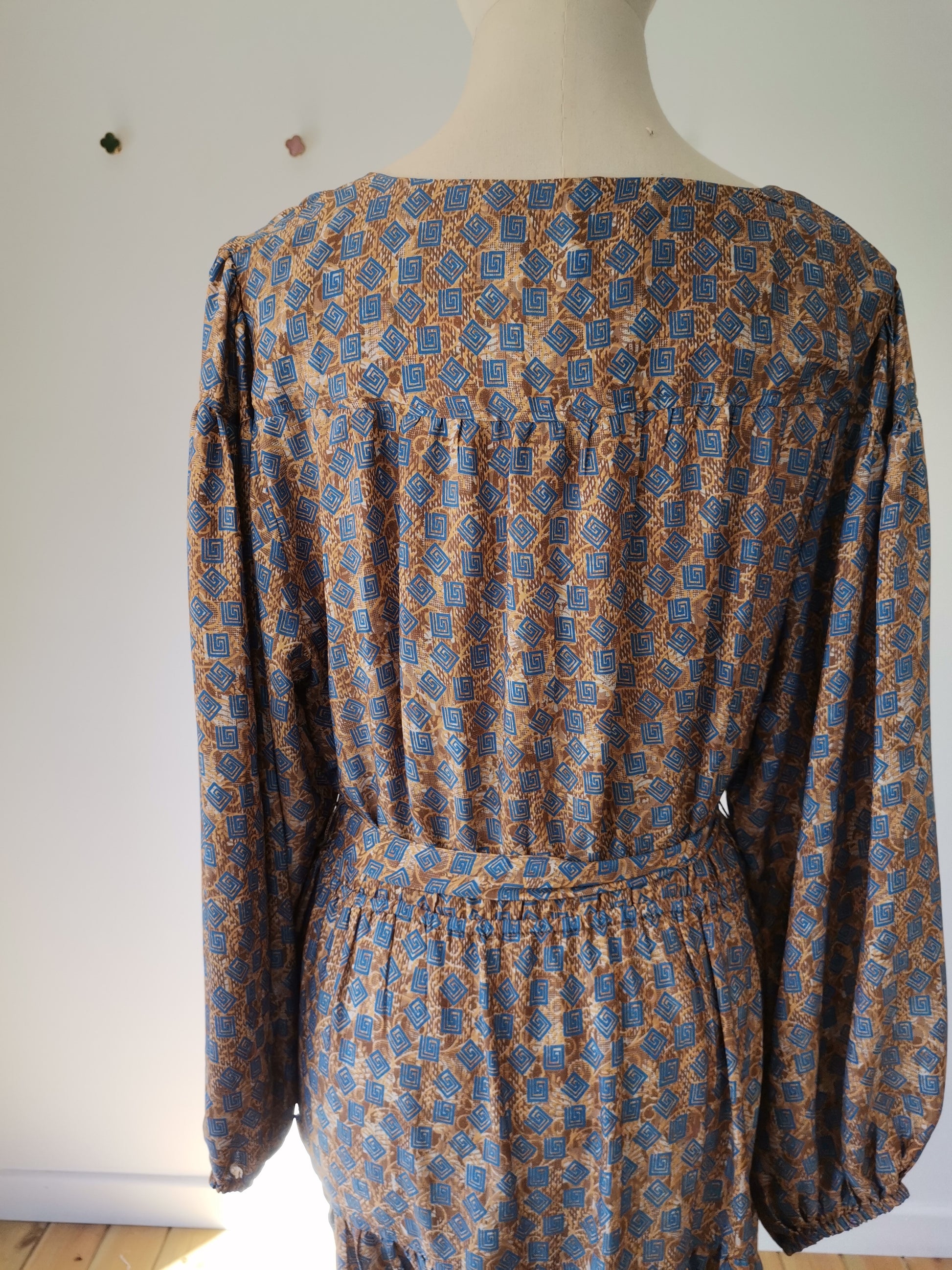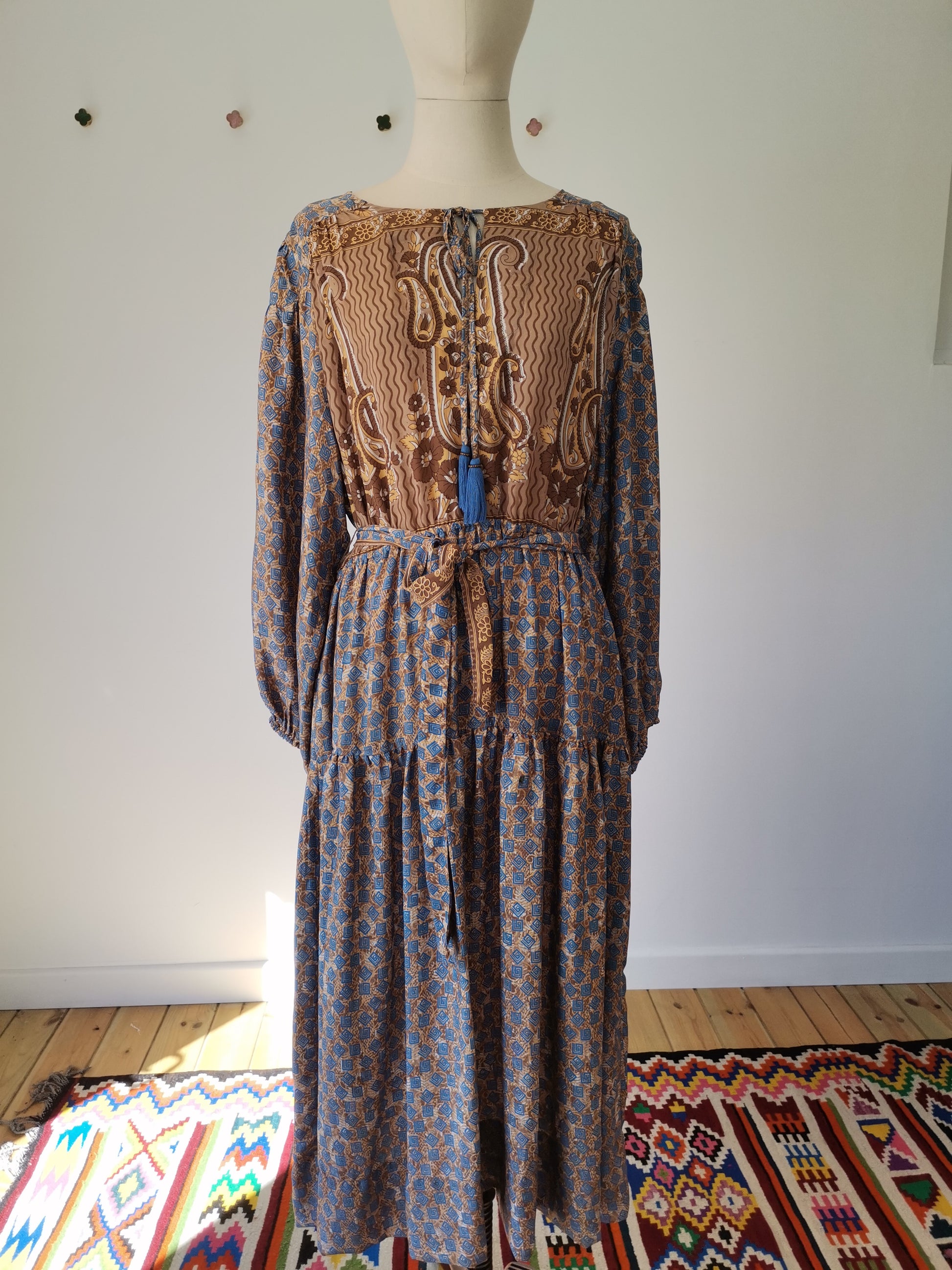 Lola is made from a beautiful upcycled vintage sari, she is super versatile and has year round appeal. Lola is the everyday dress you'll find yourself reaching for time after time, she has feminine blouson sleeves, gentle elasticated waistline with a detachable sash, cinch in the waistline for a neater fit. She has a round neckline with a deep V slit opening and can be fastened with tie bands with tassels at the front. Lola has deep side pockets at the seams.
