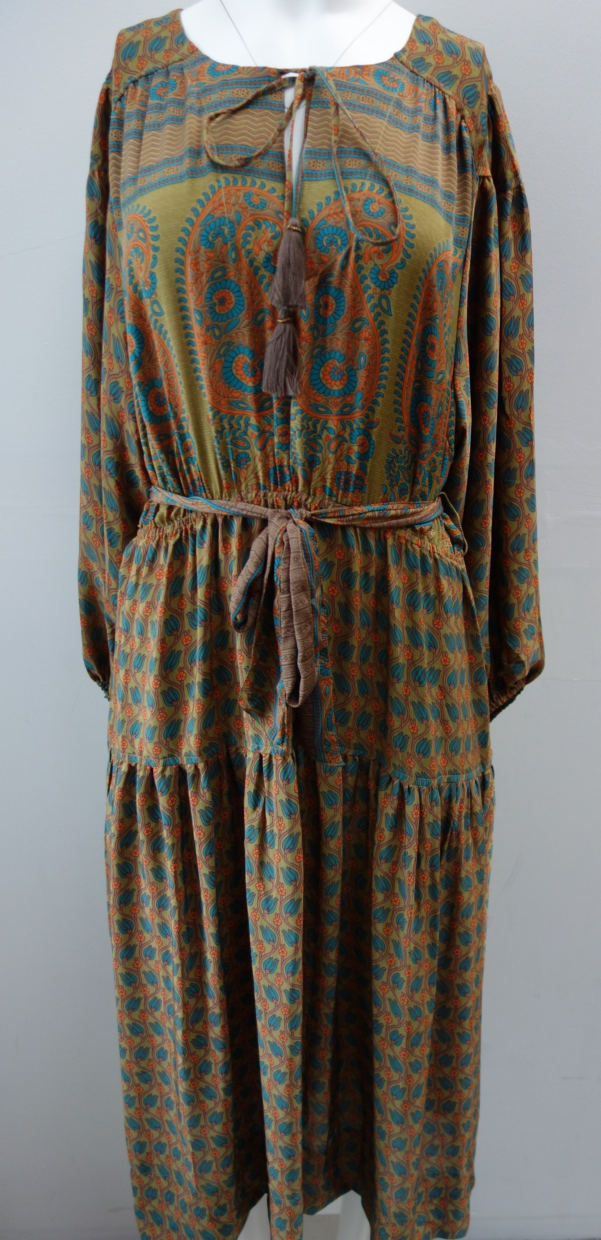 Lola is made from a beautiful upcycled vintage sari, she is super versatile and has year round appeal. Lola is the everyday dress you'll find yourself reaching for time after time, she has feminine blouson sleeves, gentle elasticated waistline with a detachable sash, cinch in the waistline for a neater fit. She has a round neckline with a deep V slit opening and can be fastened with tie bands with tassels at the front. Lola has deep side pockets at the seams.