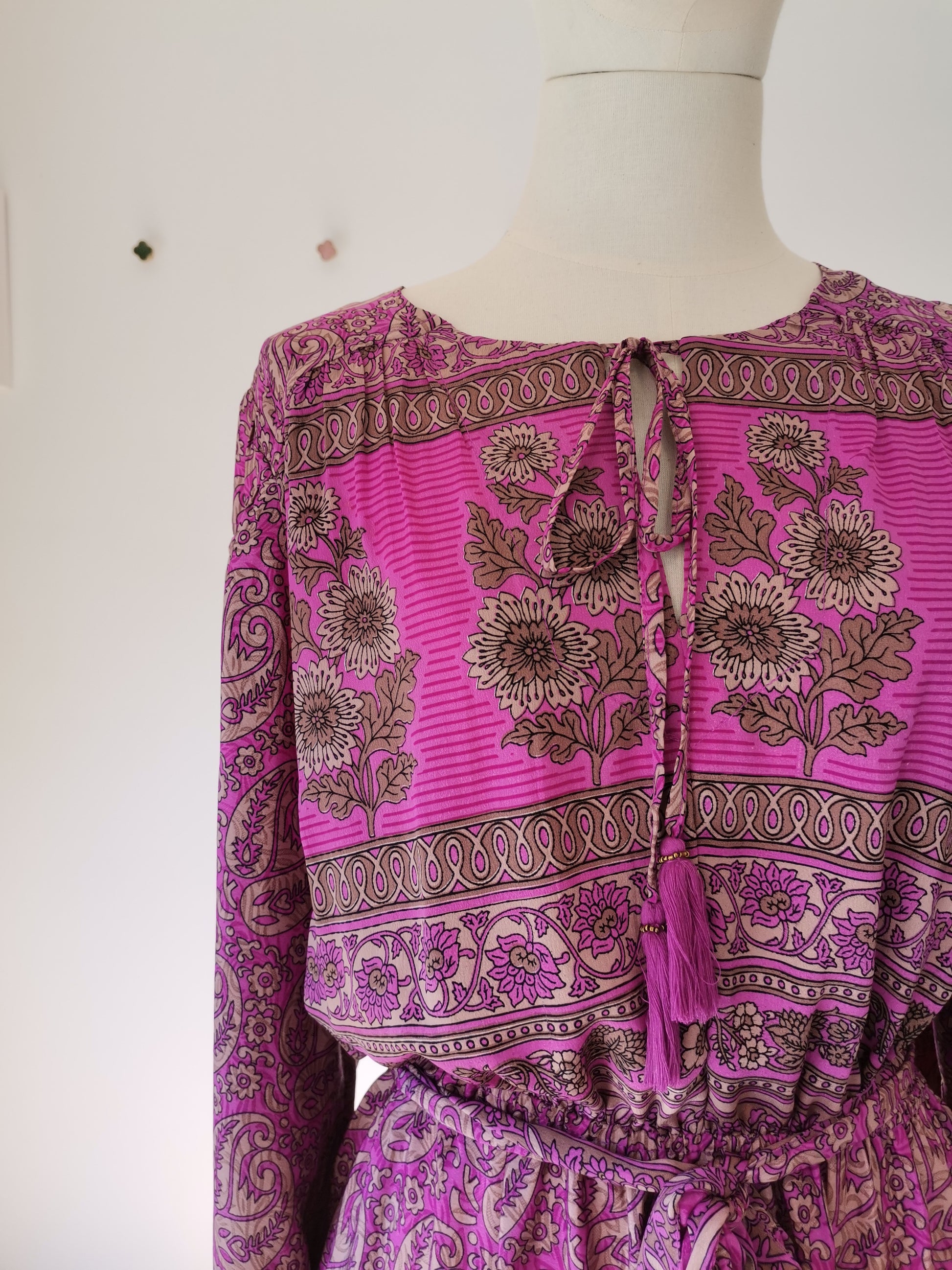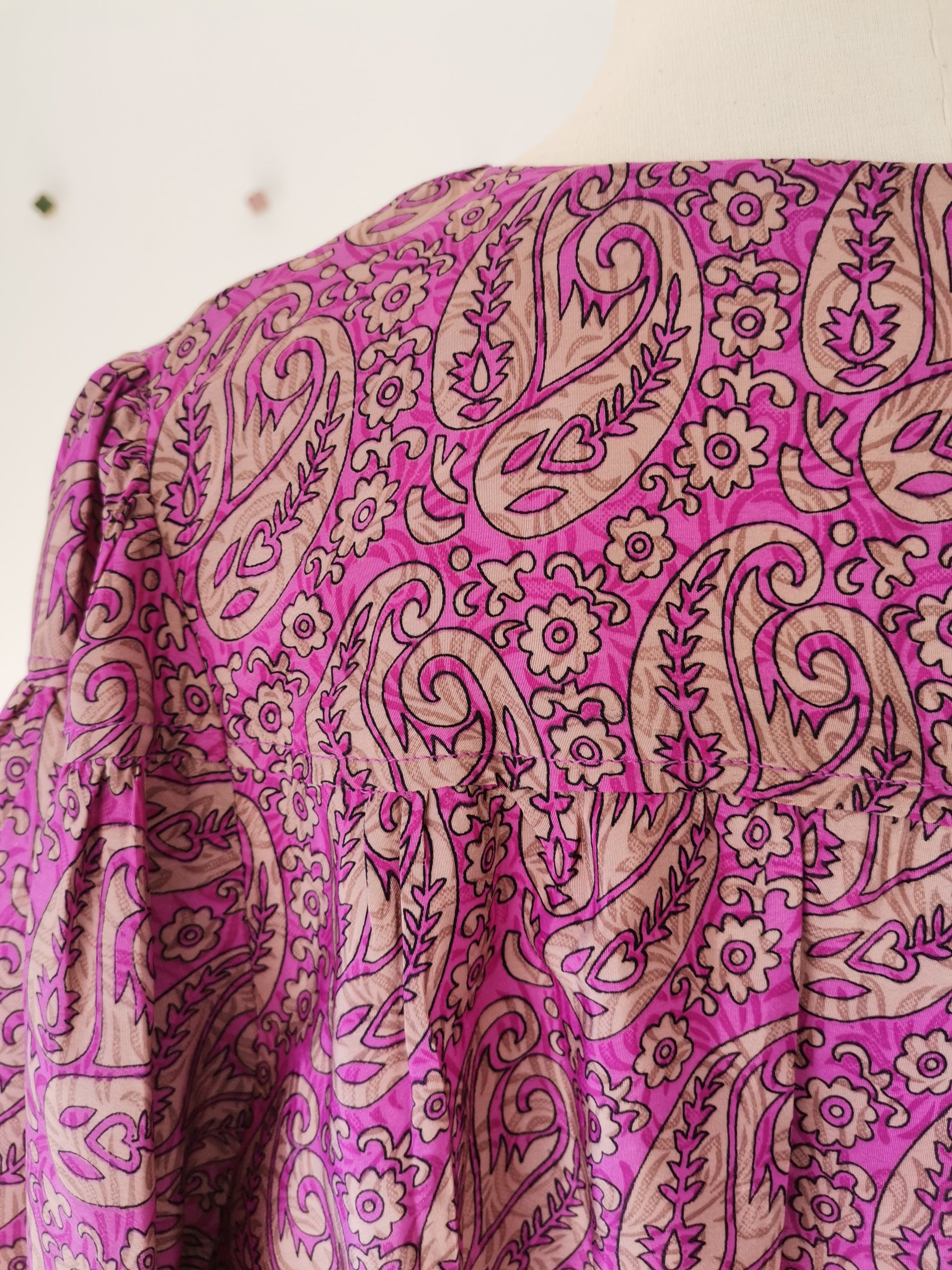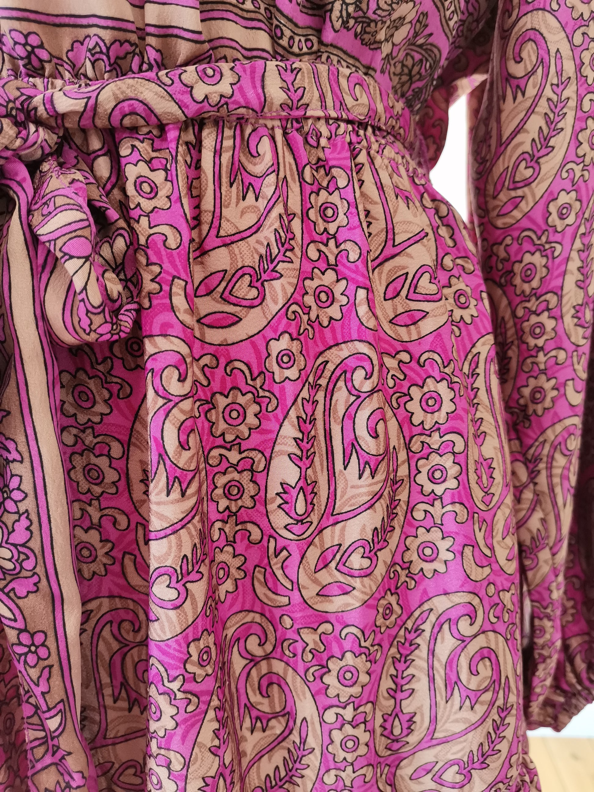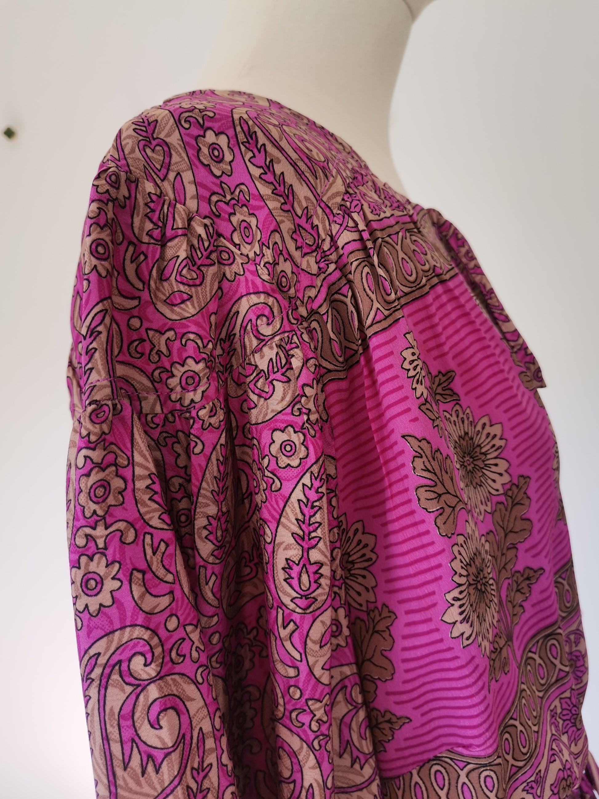Lola is made from a beautiful upcycled vintage sari, she is super versatile and has year round appeal. Lola is the everyday dress you'll find yourself reaching for time after time, she has feminine blouson sleeves, gentle elasticated waistline with a detachable sash, cinch in the waistline for a neater fit. She has a round neckline with a deep V slit opening and can be fastened with tie bands with tassels at the front. Lola has deep side pockets at the seams.