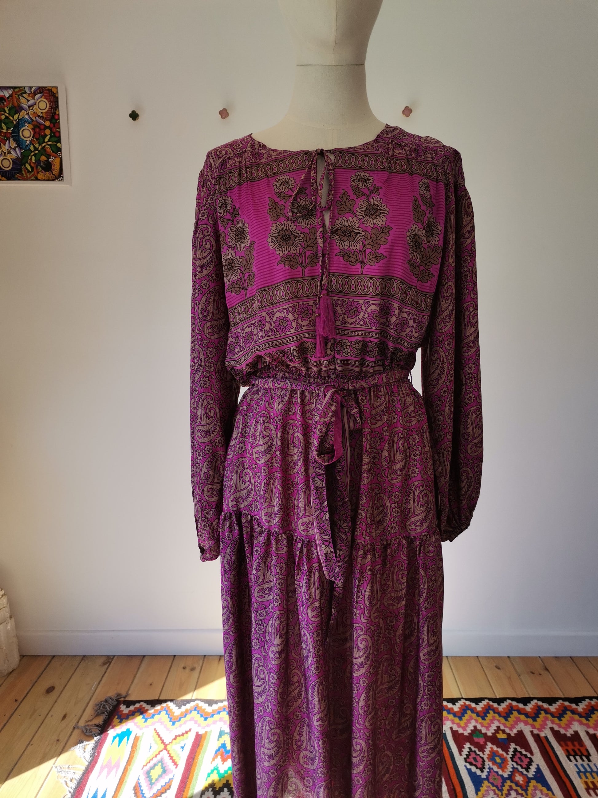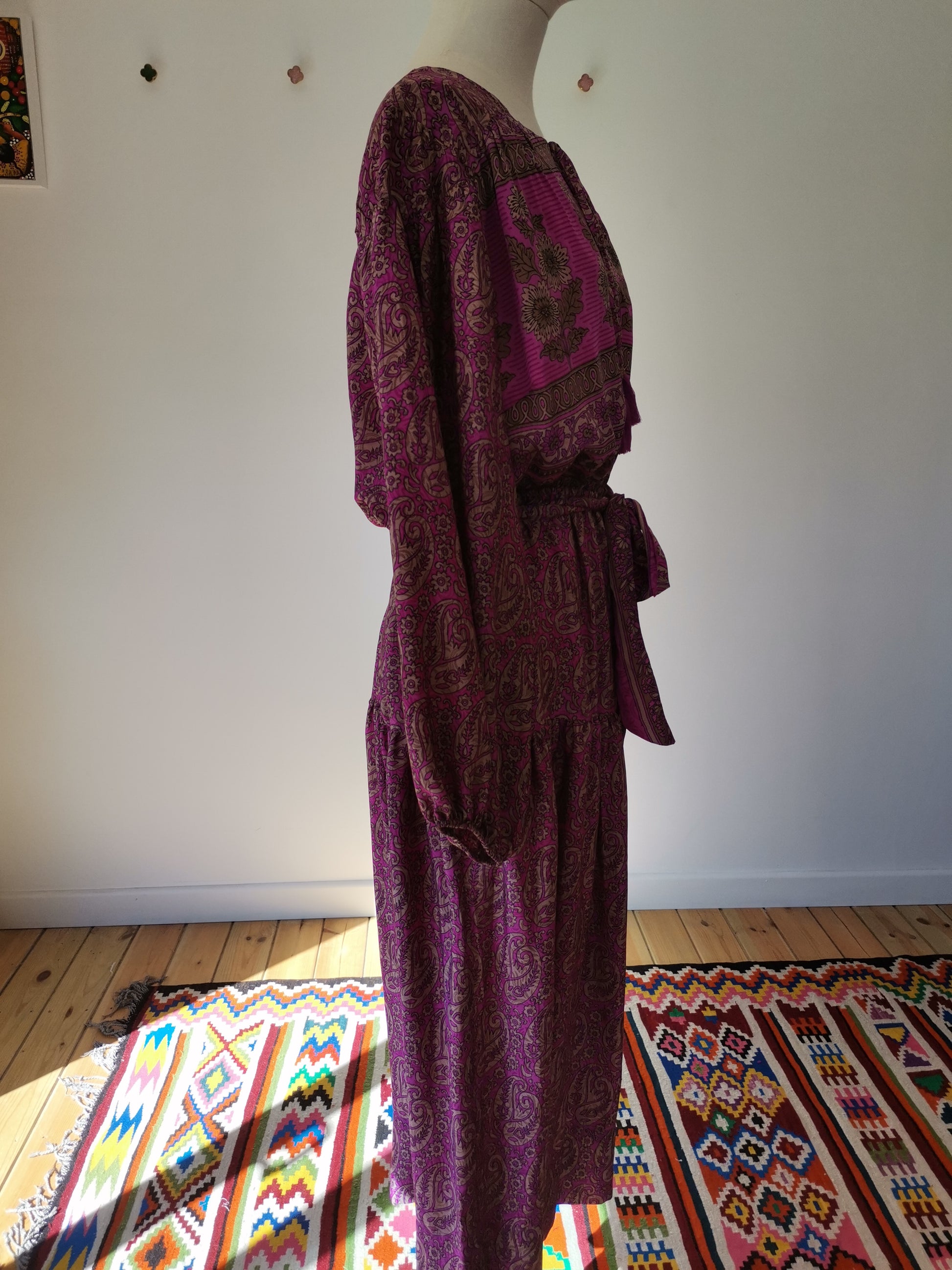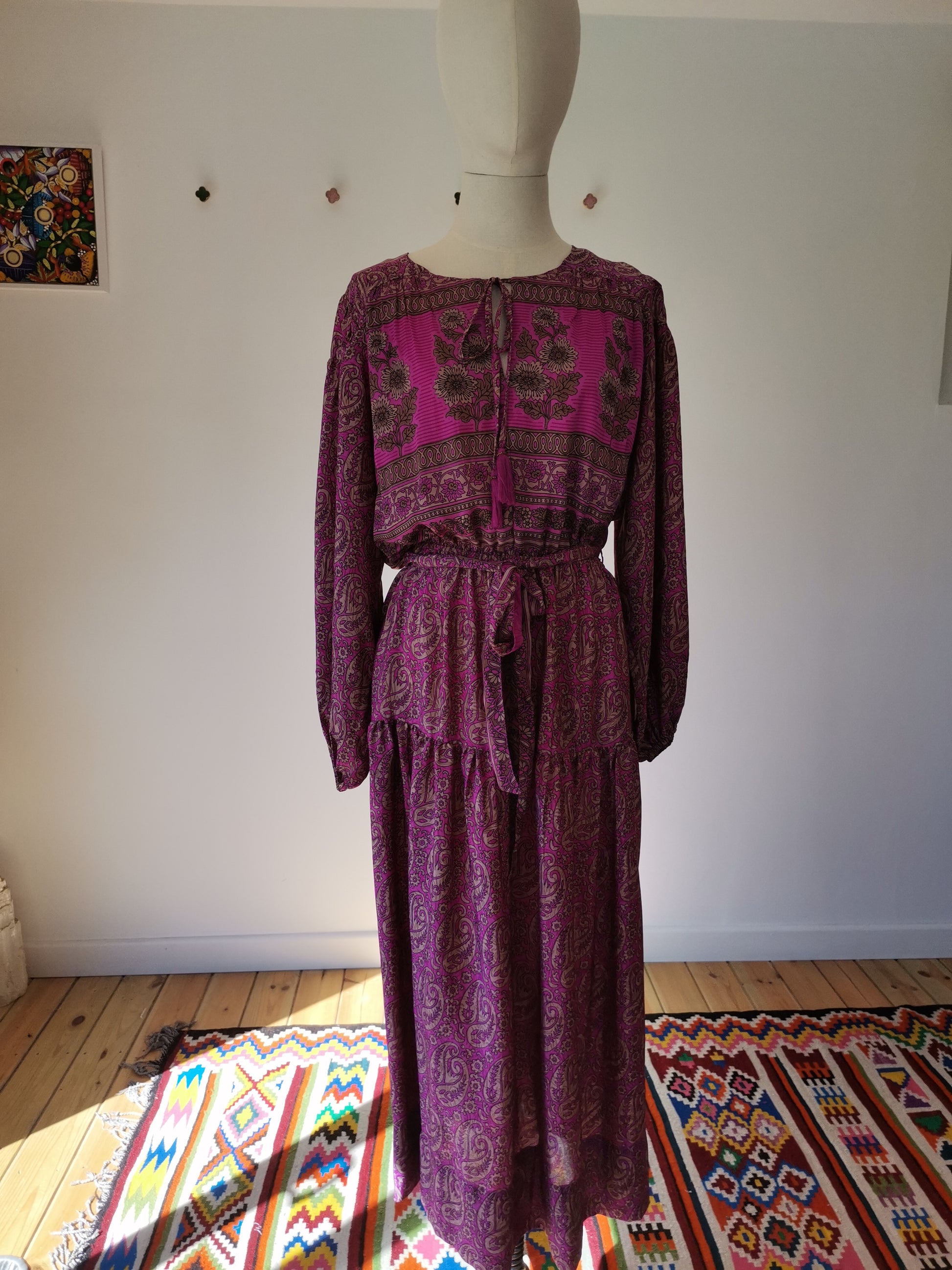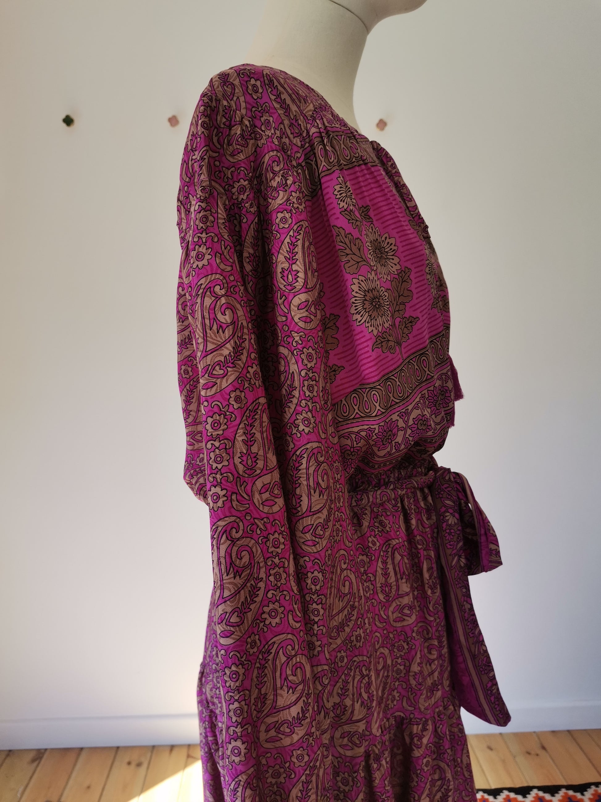 Lola is made from a beautiful upcycled vintage sari, she is super versatile and has year round appeal. Lola is the everyday dress you'll find yourself reaching for time after time, she has feminine blouson sleeves, gentle elasticated waistline with a detachable sash, cinch in the waistline for a neater fit. She has a round neckline with a deep V slit opening and can be fastened with tie bands with tassels at the front. Lola has deep side pockets at the seams.