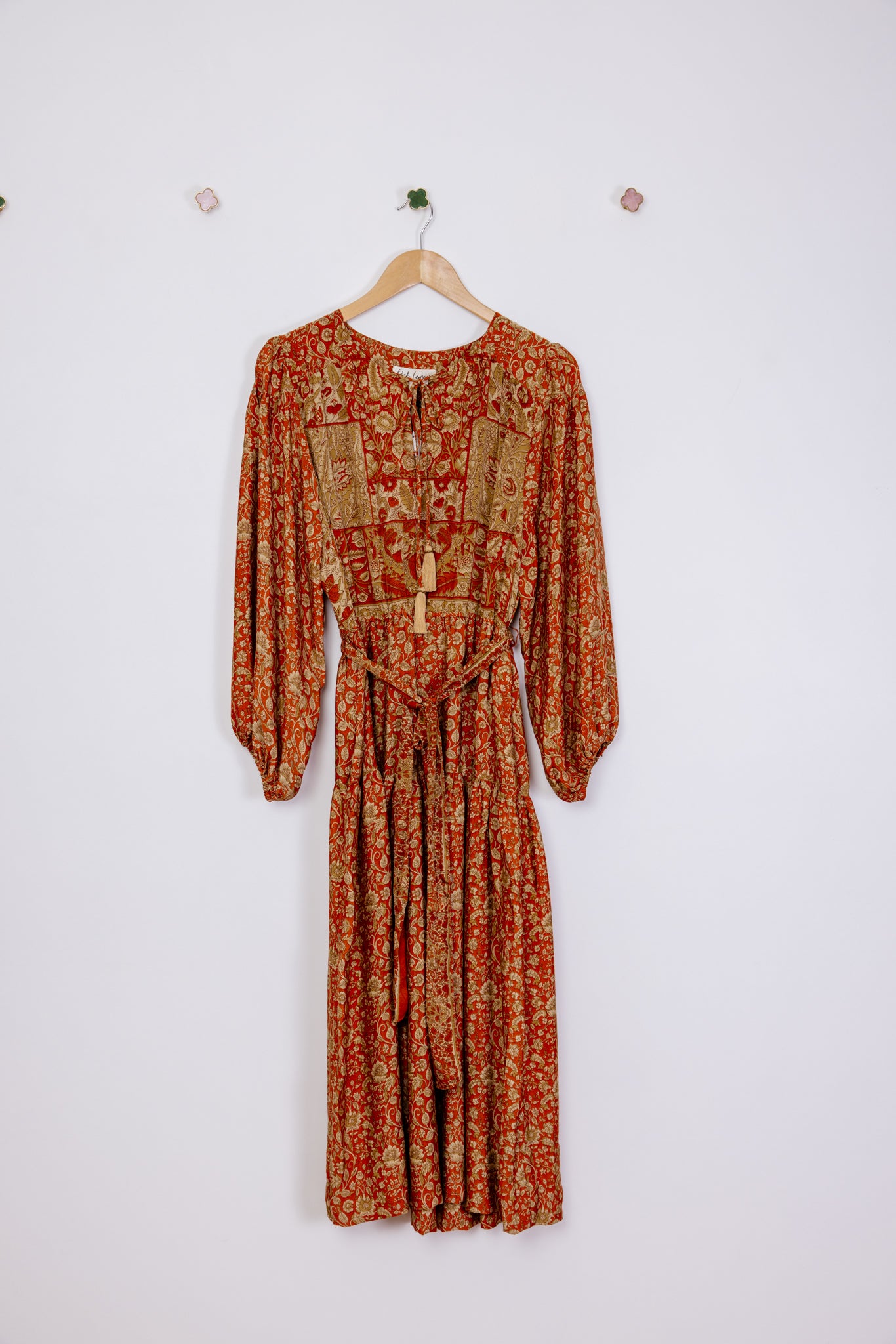 Lola is made from a beautiful upcycled vintage sari, she is super versatile and has year round appeal. Lola is the everyday dress you'll find yourself reaching for time after time, she has feminine blouson sleeves, gentle elasticated waistline with a detachable sash, cinch in the waistline for a neater fit. She has a round neckline with a deep V slit opening and can be fastened with tie bands with tassels at the front. Lola has deep side pockets at the seams.