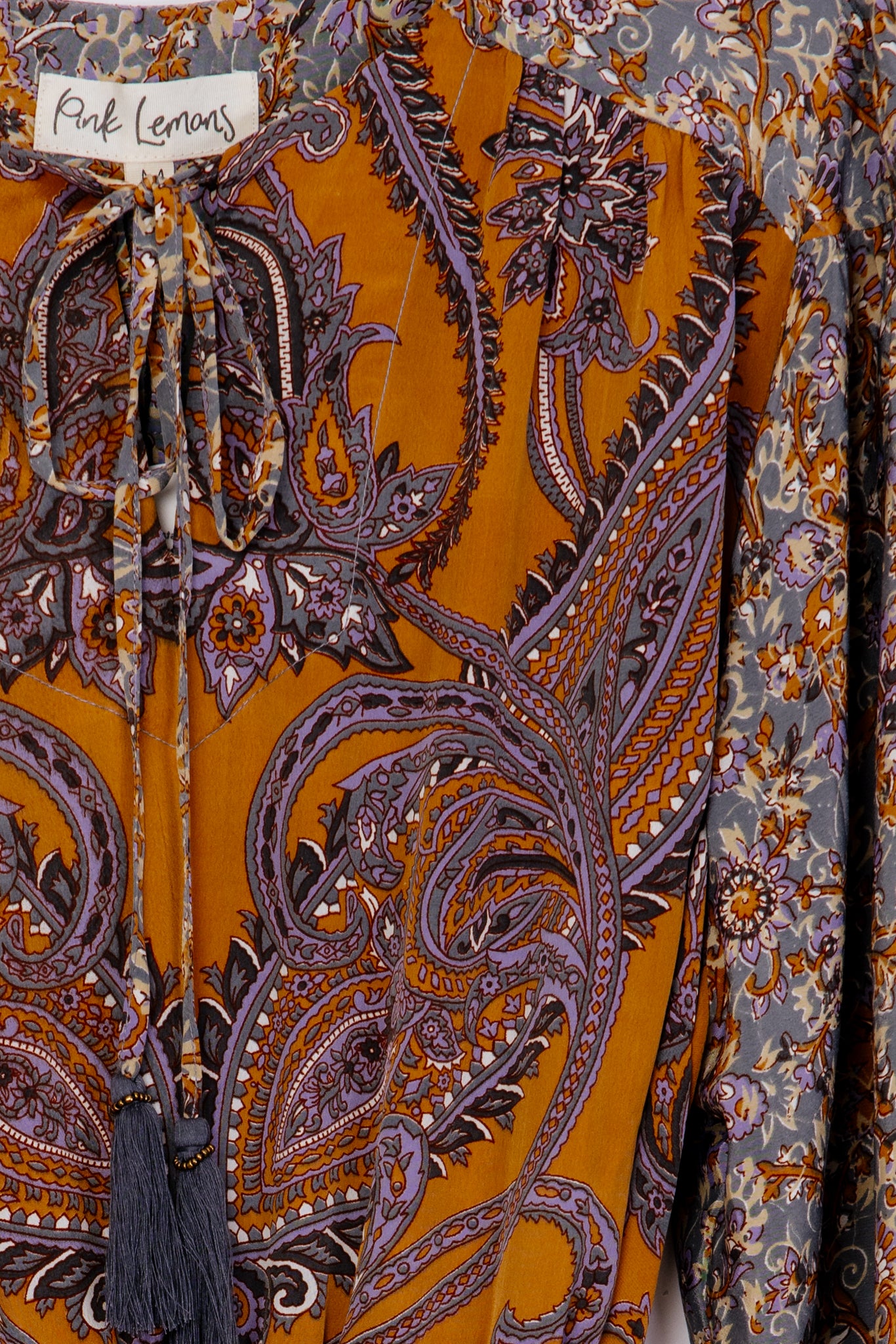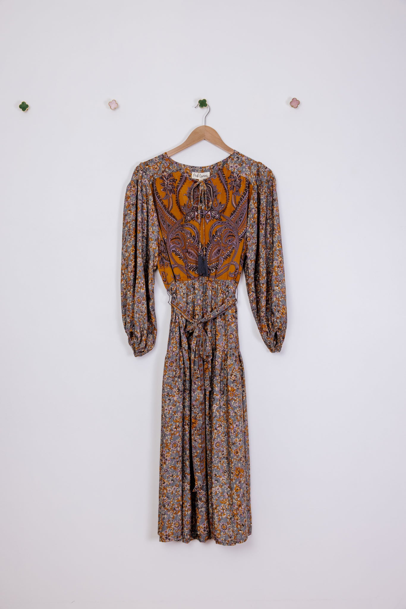 Lola is made from a beautiful upcycled vintage sari, she is super versatile and has year round appeal. Lola is the everyday dress you'll find yourself reaching for time after time, she has feminine blouson sleeves, gentle elasticated waistline with a detachable sash, cinch in the waistline for a neater fit. She has a round neckline with a deep V slit opening and can be fastened with tie bands with tassels at the front. Lola has deep side pockets at the seams.