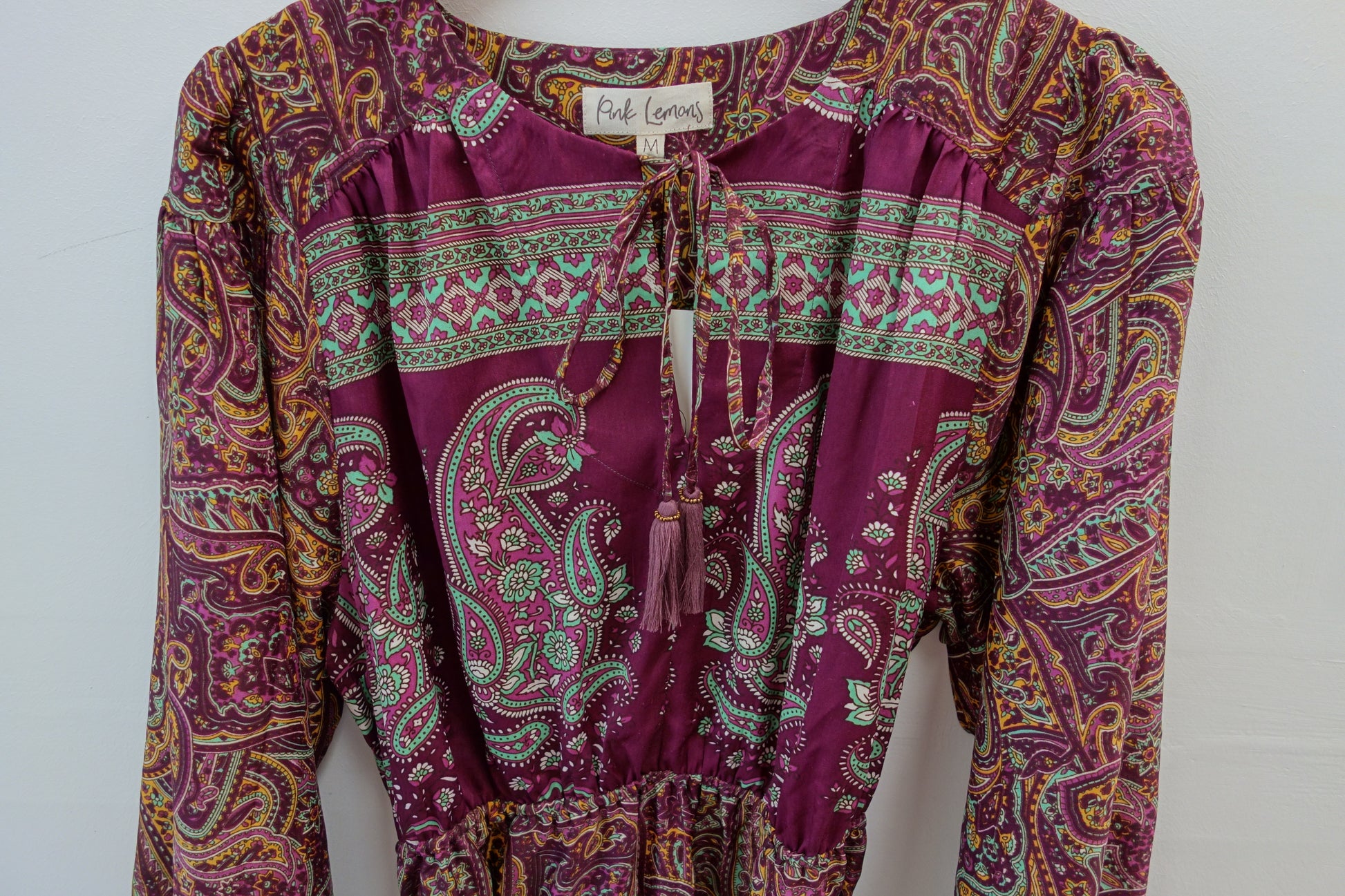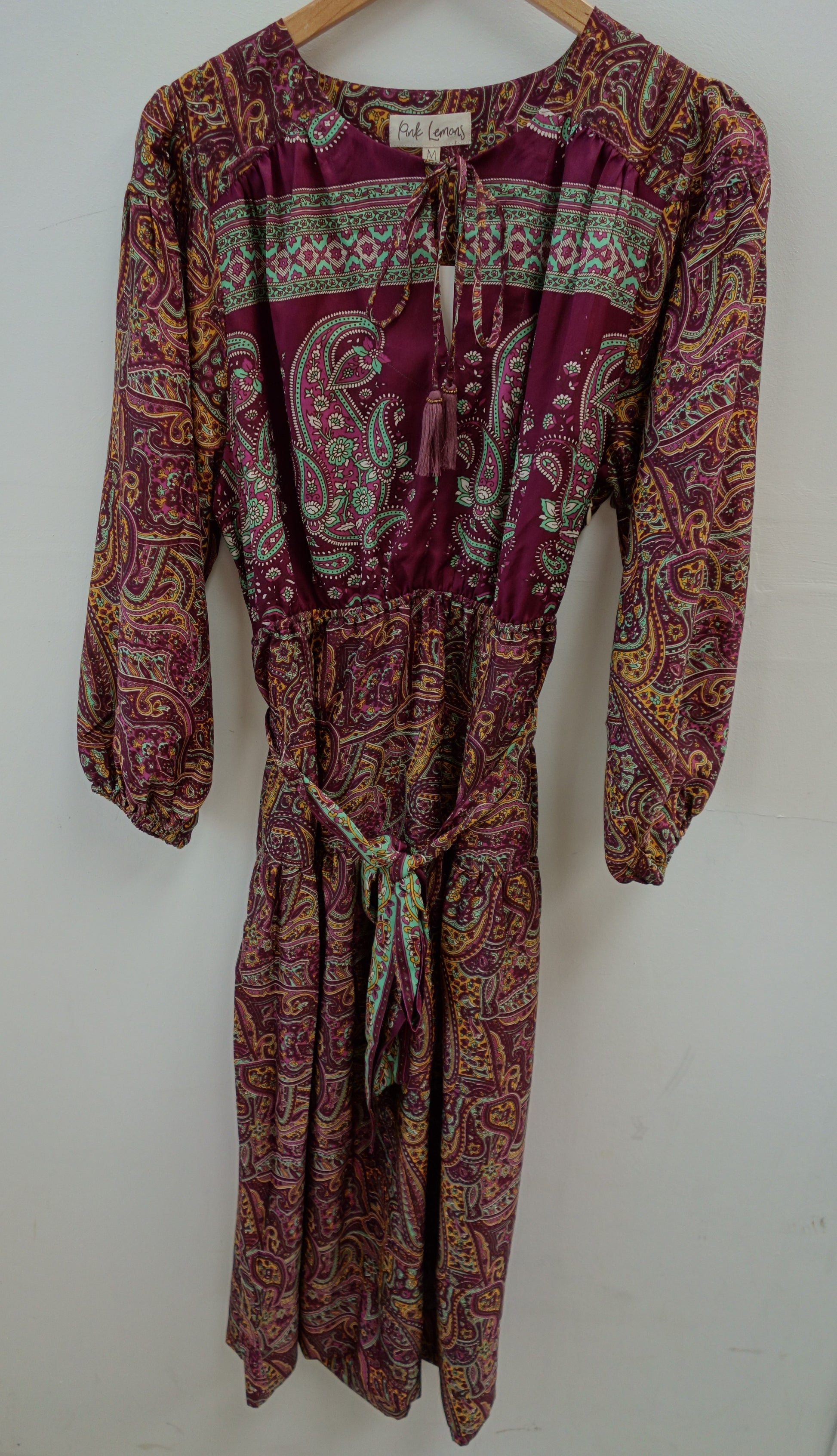 Lola is made from a beautiful upcycled vintage sari, she is super versatile and has year round appeal. Lola is the everyday dress you'll find yourself reaching for time after time, she has feminine blouson sleeves, gentle elasticated waistline with a detachable sash, cinch in the waistline for a neater fit. She has a round neckline with a deep V slit opening and can be fastened with tie bands with tassels at the front. Lola has deep side pockets at the seams.