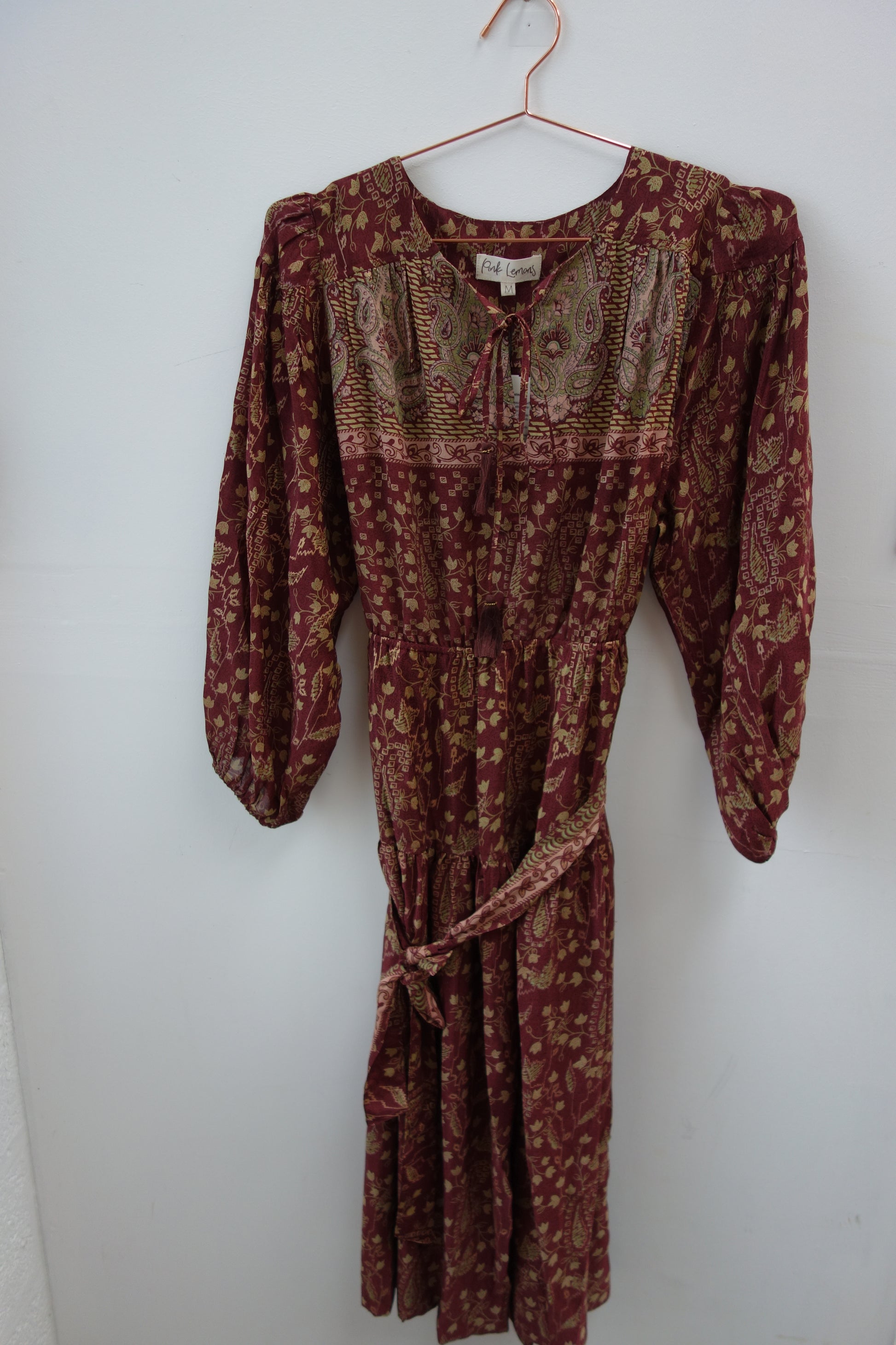 Lola is made from a beautiful upcycled vintage sari, she is super versatile and has year round appeal. Lola is the everyday dress you'll find yourself reaching for time after time, she has feminine blouson sleeves, gentle elasticated waistline with a detachable sash, cinch in the waistline for a neater fit. She has a round neckline with a deep V slit opening and can be fastened with tie bands with tassels at the front. Lola has deep side pockets at the seams.