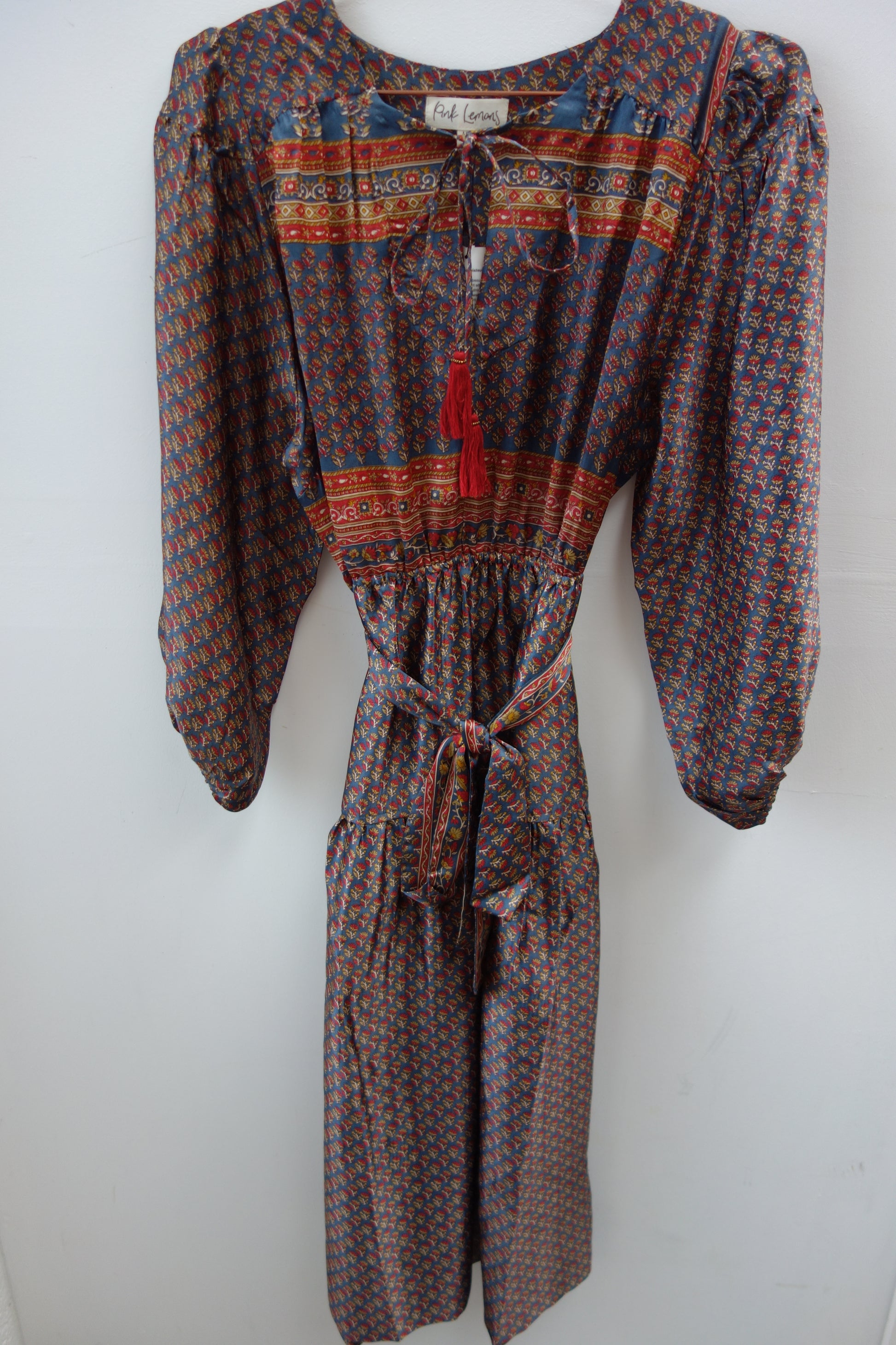 Lola is made from a beautiful upcycled vintage sari, she is super versatile and has year round appeal. Lola is the everyday dress you'll find yourself reaching for time after time, she has feminine blouson sleeves, gentle elasticated waistline with a detachable sash, cinch in the waistline for a neater fit. She has a round neckline with a deep V slit opening and can be fastened with tie bands with tassels at the front. Lola has deep side pockets at the seams.