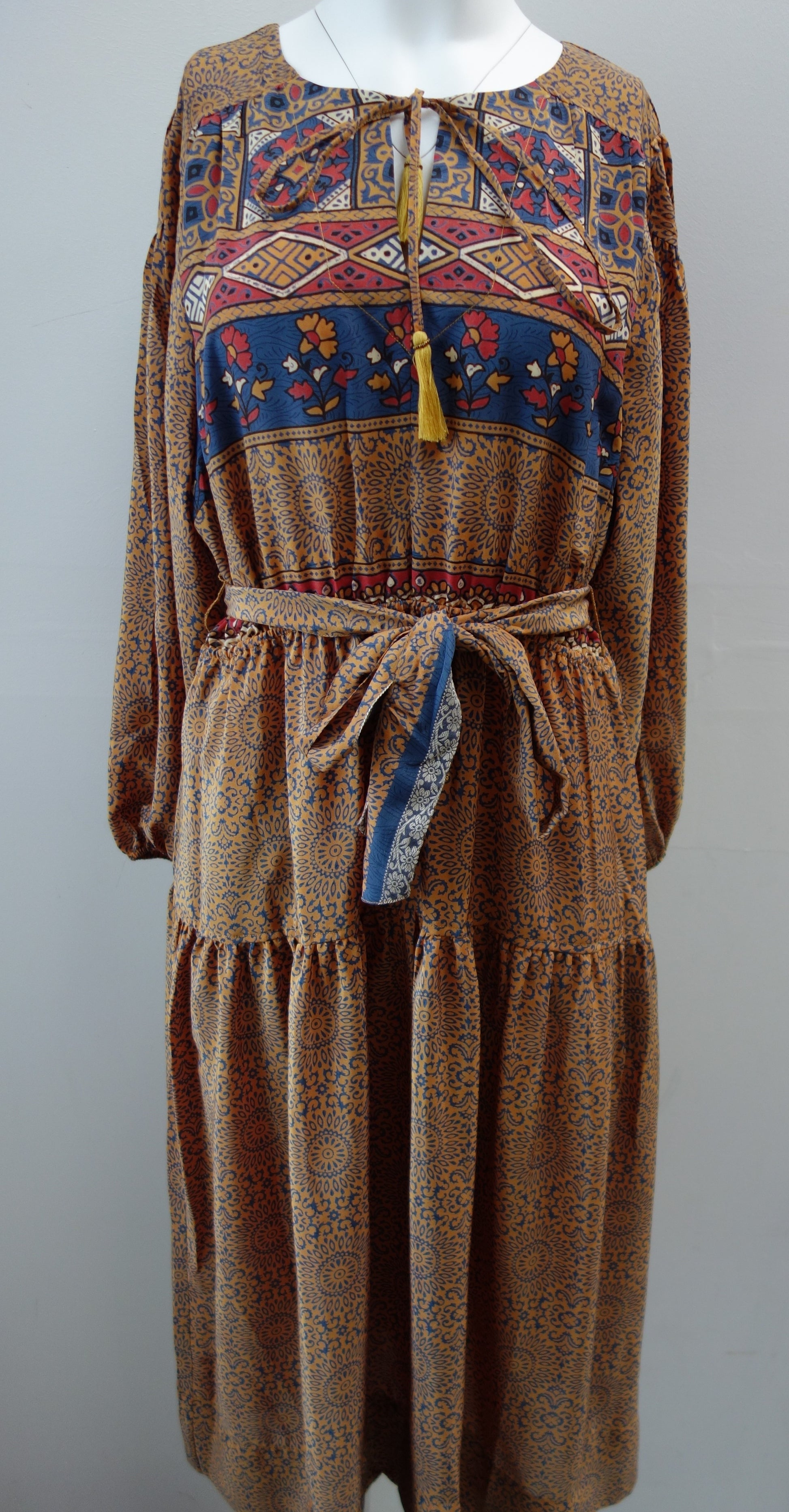 Lola is made from a beautiful upcycled vintage sari, she is super versatile and has year round appeal. Lola is the everyday dress you'll find yourself reaching for time after time, she has feminine blouson sleeves, gentle elasticated waistline with a detachable sash, cinch in the waistline for a neater fit. She has a round neckline with a deep V slit opening and can be fastened with tie bands with tassels at the front. Lola has deep side pockets at the seams.