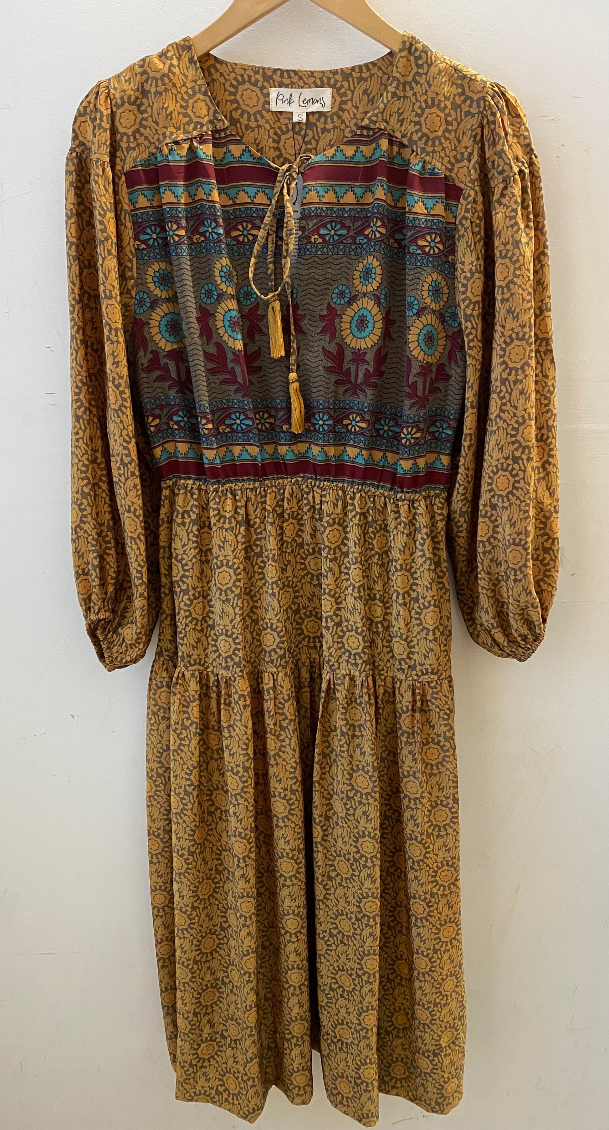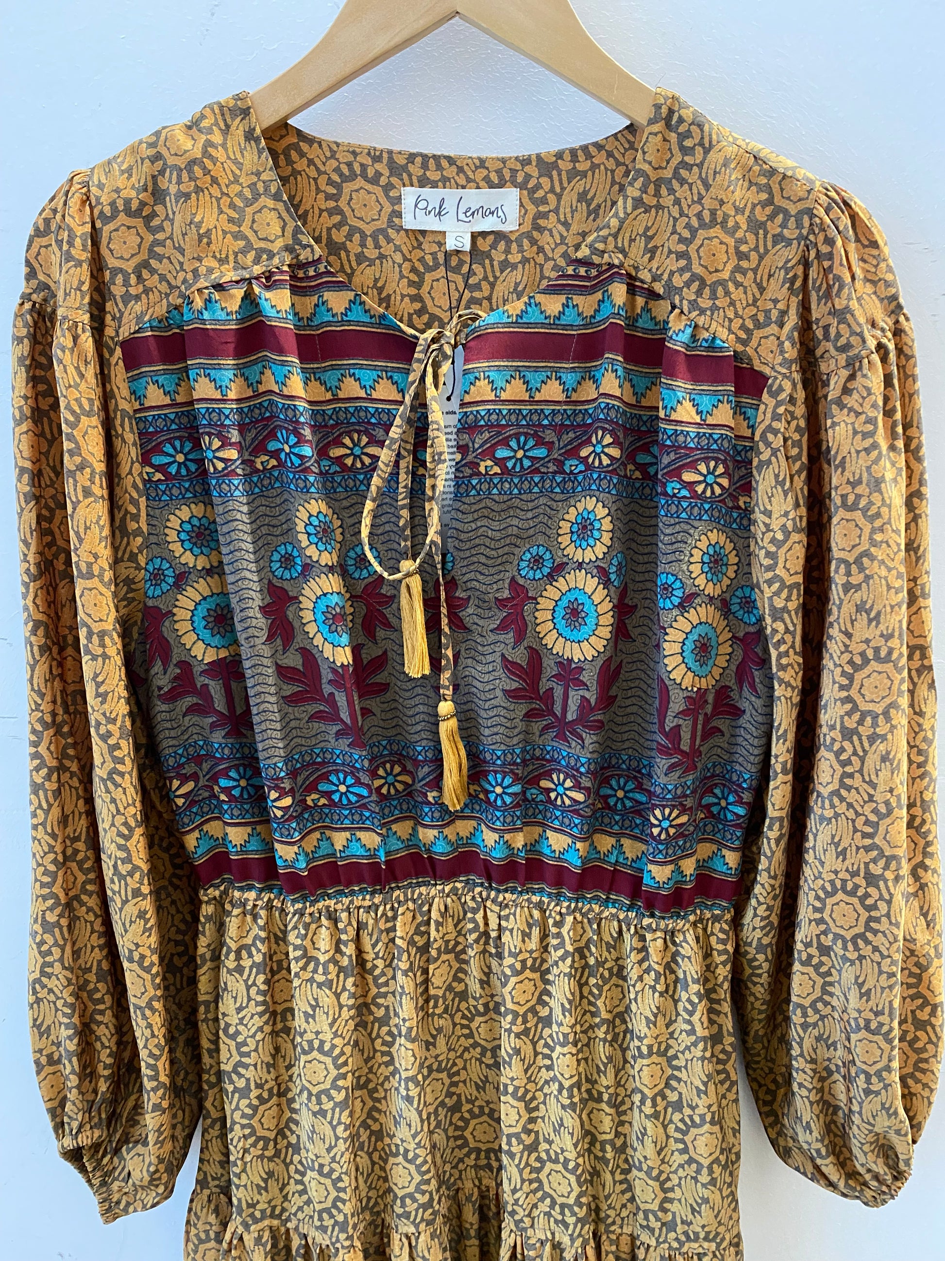 Lola is made from a beautiful upcycled vintage sari , she is super versatile and with year round appeal. Lola is the everyday dress you'll find yourself reaching for time after time , she has feminine blouson sleeves , gentle elasticated waistline with a detachable sash , cinch in the waistline for a neater fit . She has a round neckline with a deep V slit opening and can be fastened with tie bands with tassels at the front . Lola has deep side pockets at the seams.
