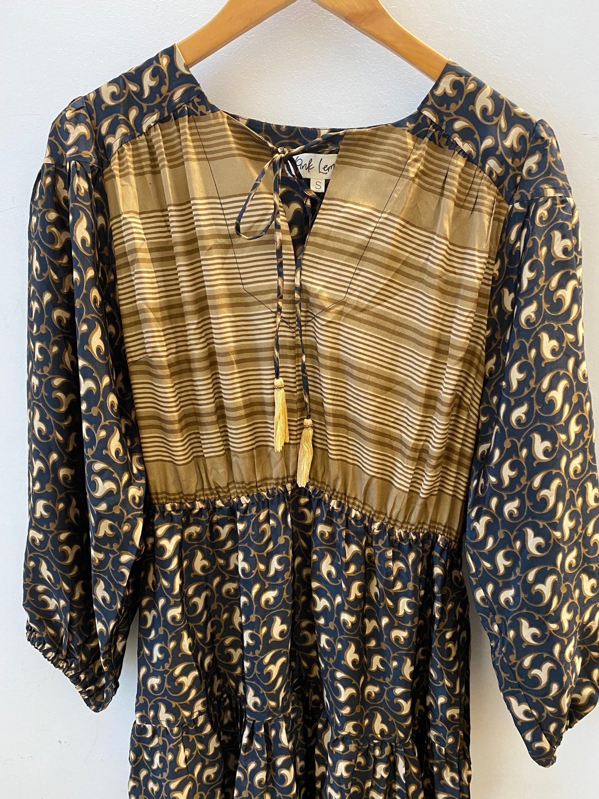 Lola is made from a beautiful upcycled vintage sari , she is super versatile and with year round appeal. Lola is the everyday dress you'll find yourself reaching for time after time , she has feminine blouson sleeves , gentle elasticated waistline with a detachable sash , cinch in the waistline for a neater fit . She has a round neckline with a deep V slit opening and can be fastened with tie bands with tassels at the front . Lola has deep side pockets at the seams.