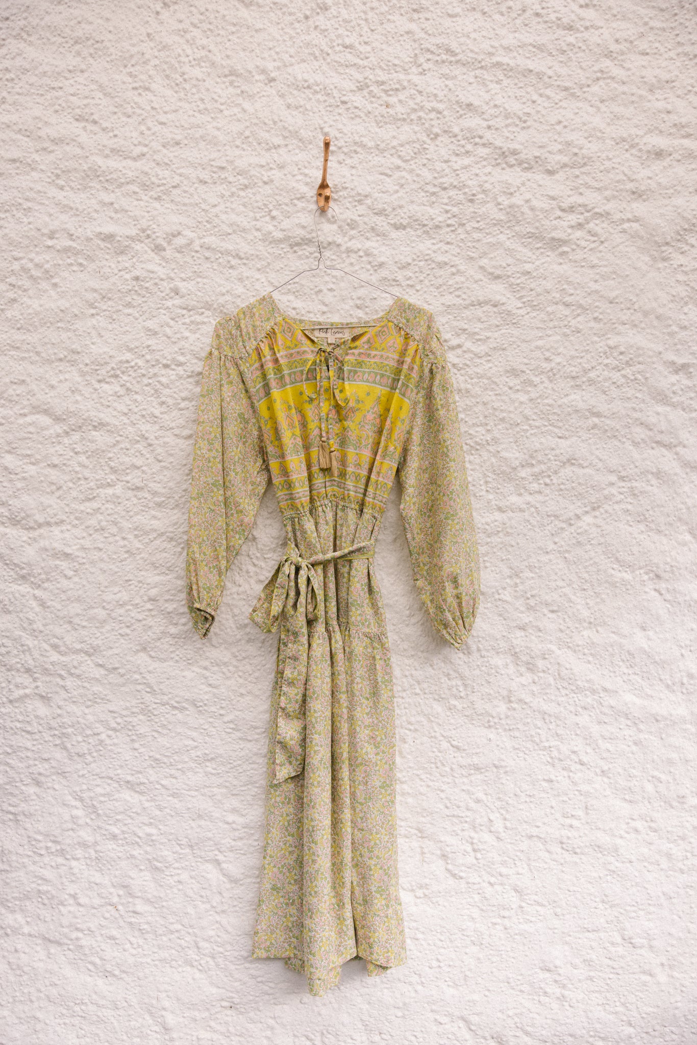 Lola is made from a beautiful upcycled vintage sari, she is super versatile and has year round appeal. Lola is the everyday dress you'll find yourself reaching for time after time, she has feminine blouson sleeves, gentle elasticated waistline with a detachable sash, cinch in the waistline for a neater fit. She has a round neckline with a deep V slit opening and can be fastened with tie bands with tassels at the front. Lola has deep side pockets at the seams.