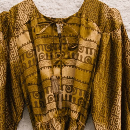 Lola is made from a beautiful upcycled vintage sari, she is super versatile and has year round appeal. Lola is the everyday dress you'll find yourself reaching for time after time, she has feminine blouson sleeves, gentle elasticated waistline with a detachable sash, cinch in the waistline for a neater fit. She has a round neckline with a deep V slit opening and can be fastened with tie bands with tassels at the front. Lola has deep side pockets at the seams.