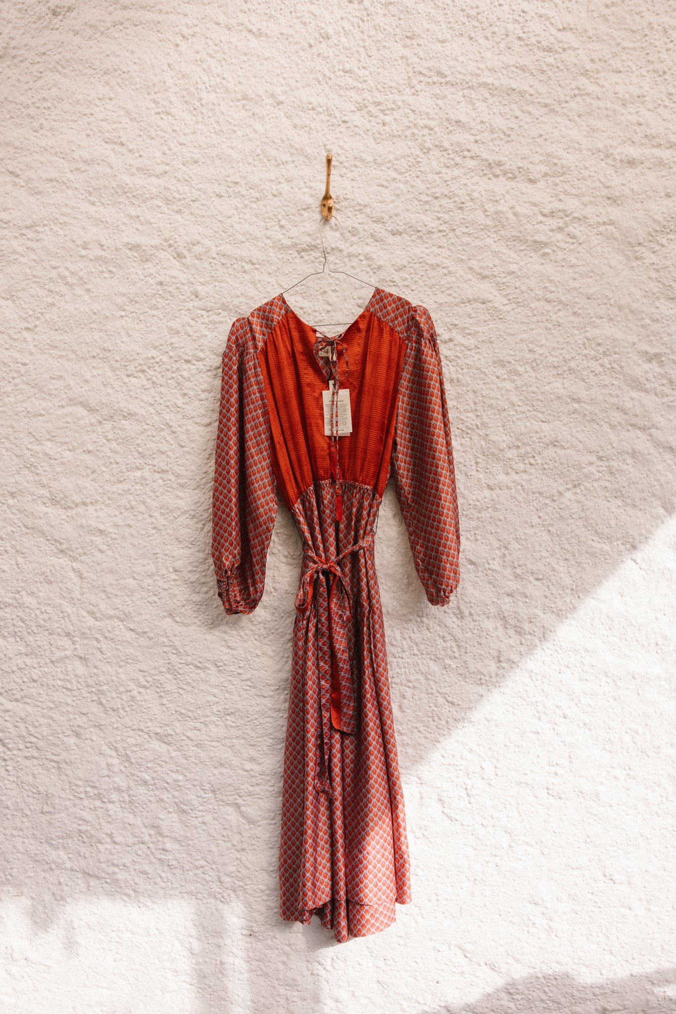 Lola is made from a beautiful upcycled vintage sari, she is super versatile and has year round appeal. Lola is the everyday dress you'll find yourself reaching for time after time, she has feminine blouson sleeves, gentle elasticated waistline with a detachable sash, cinch in the waistline for a neater fit. She has a round neckline with a deep V slit opening and can be fastened with tie bands with tassels at the front. Lola has deep side pockets at the seams.