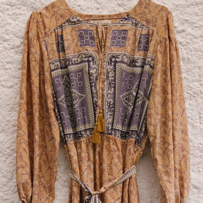 Lola is made from a beautiful upcycled vintage sari, she is super versatile and has year round appeal. Lola is the everyday dress you'll find yourself reaching for time after time, she has feminine blouson sleeves, gentle elasticated waistline with a detachable sash, cinch in the waistline for a neater fit. She has a round neckline with a deep V slit opening and can be fastened with tie bands with tassels at the front. Lola has deep side pockets at the seams.