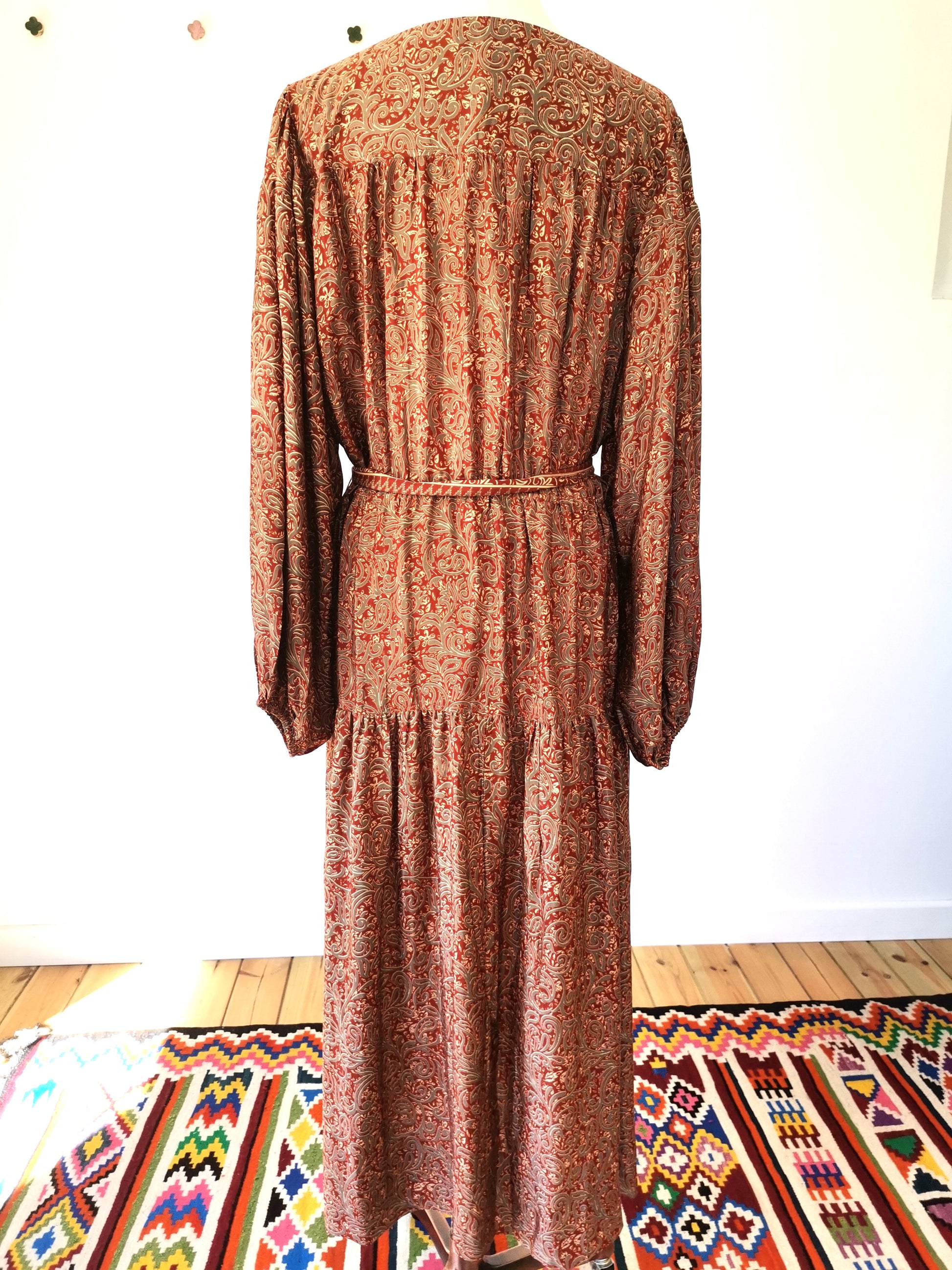 Lola is made from a beautiful upcycled vintage sari, she is super versatile and has year round appeal. Lola is the everyday dress you'll find yourself reaching for time after time, she has feminine blouson sleeves, gentle elasticated waistline with a detachable sash, cinch in the waistline for a neater fit. She has a round neckline with a deep V slit opening and can be fastened with tie bands with tassels at the front. Lola has deep side pockets at the seams.