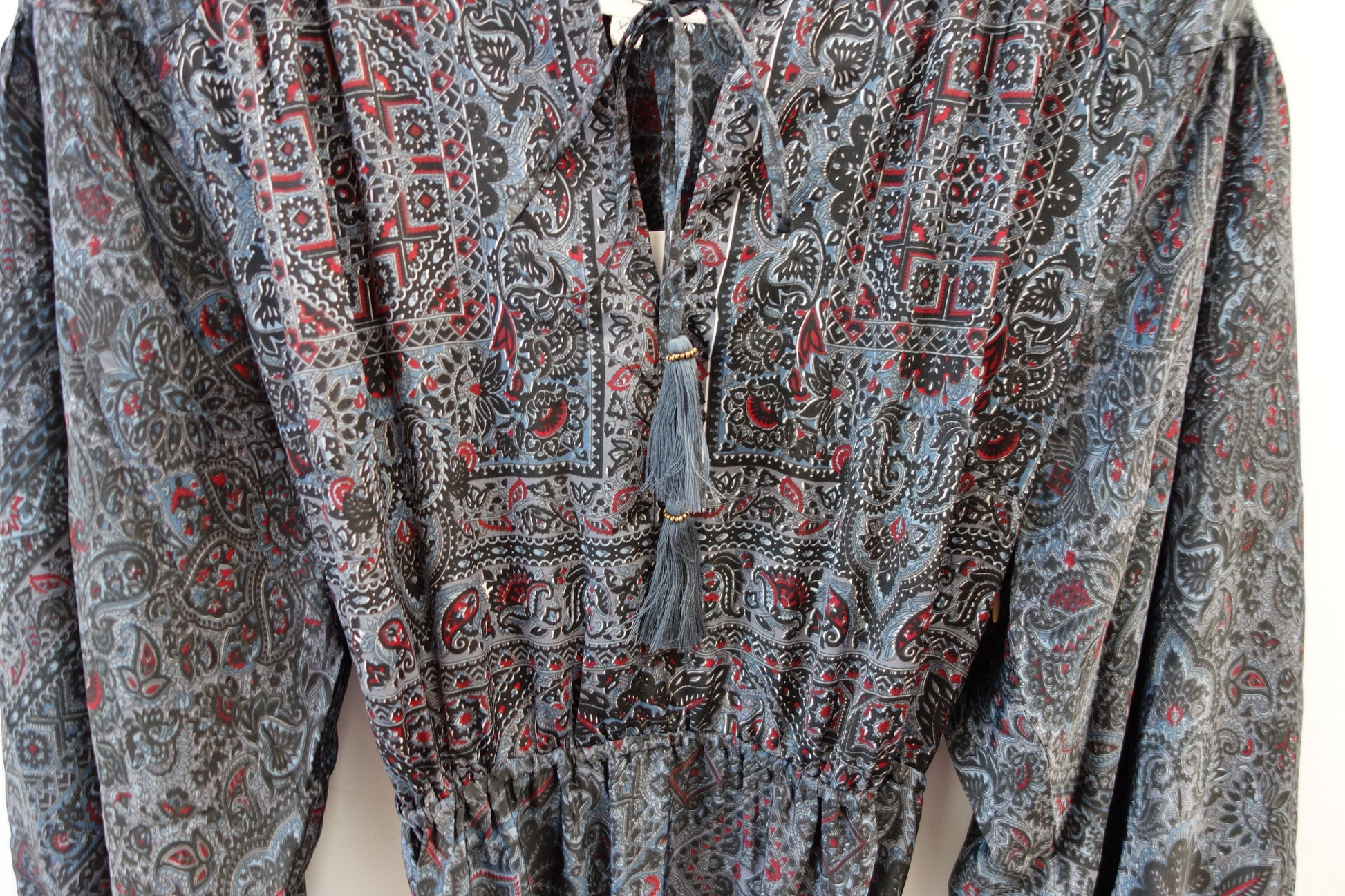 Lola is made from a beautiful upcycled vintage sari , she is super versatile and with year round appeal. Lola is the everyday dress you'll find yourself reaching for time after time , she has feminine blouson sleeves , gentle elasticated waistline with a detachable sash , cinch in the waistline for a neater fit . She has a round neckline with a deep V slit opening and can be fastened with tie bands with tassels at the front . Lola has deep side pockets at the seams.
