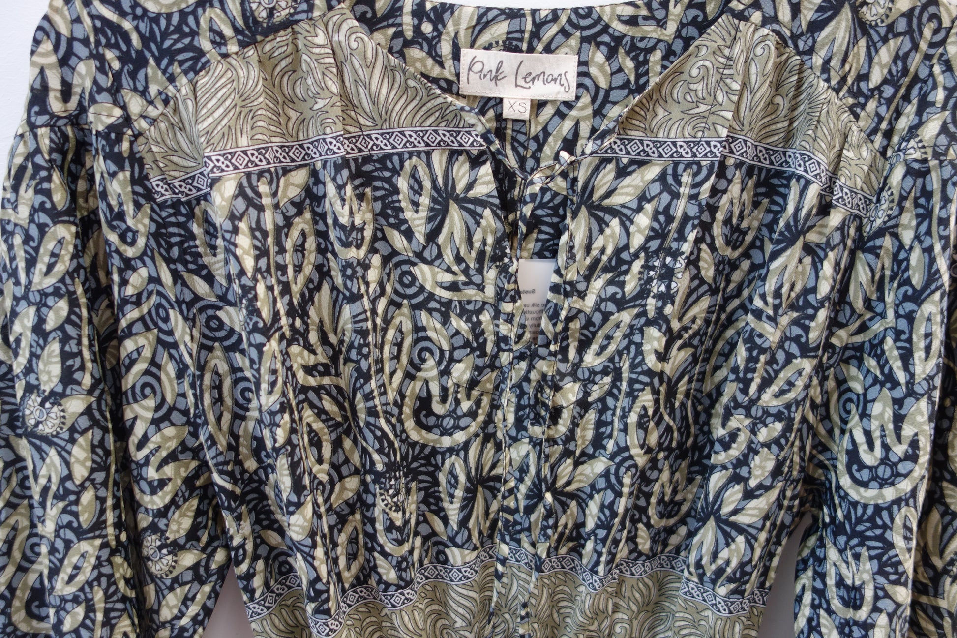 Lola is made from a beautiful upcycled vintage sari , she is super versatile and with year round appeal. Lola is the everyday dress you'll find yourself reaching for time after time , she has feminine blouson sleeves , gentle elasticated waistline with a detachable sash , cinch in the waistline for a neater fit . She has a round neckline with a deep V slit opening and can be fastened with tie bands with tassels at the front . Lola has deep side pockets at the seams.