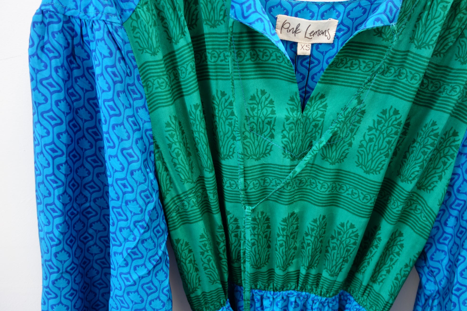 Lola is made from a beautiful upcycled vintage sari , she is super versatile and with year round appeal. Lola is the everyday dress you'll find yourself reaching for time after time , she has feminine blouson sleeves , gentle elasticated waistline with a detachable sash , cinch in the waistline for a neater fit . She has a round neckline with a deep V slit opening and can be fastened with tie bands with tassels at the front . Lola has deep side pockets at the seams.