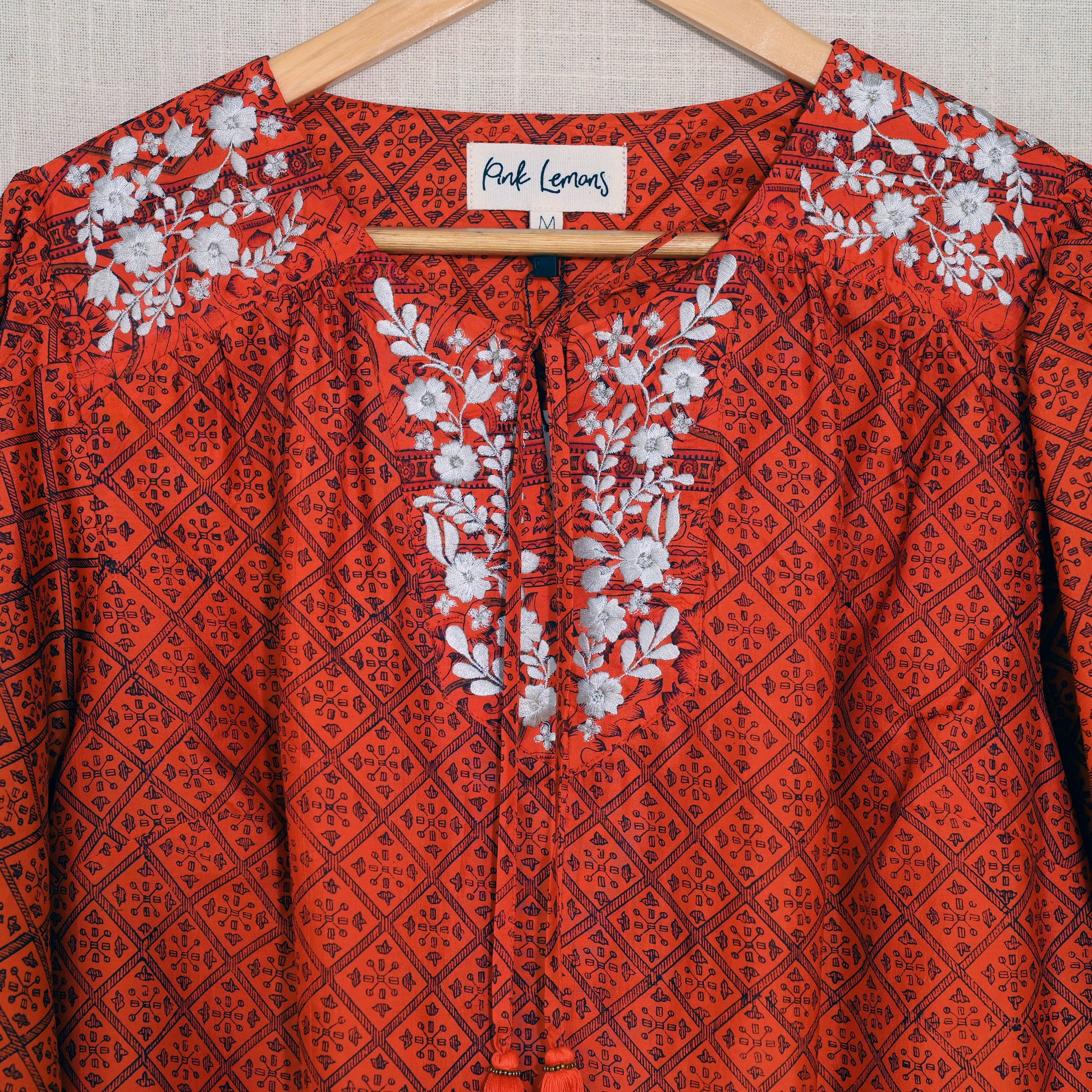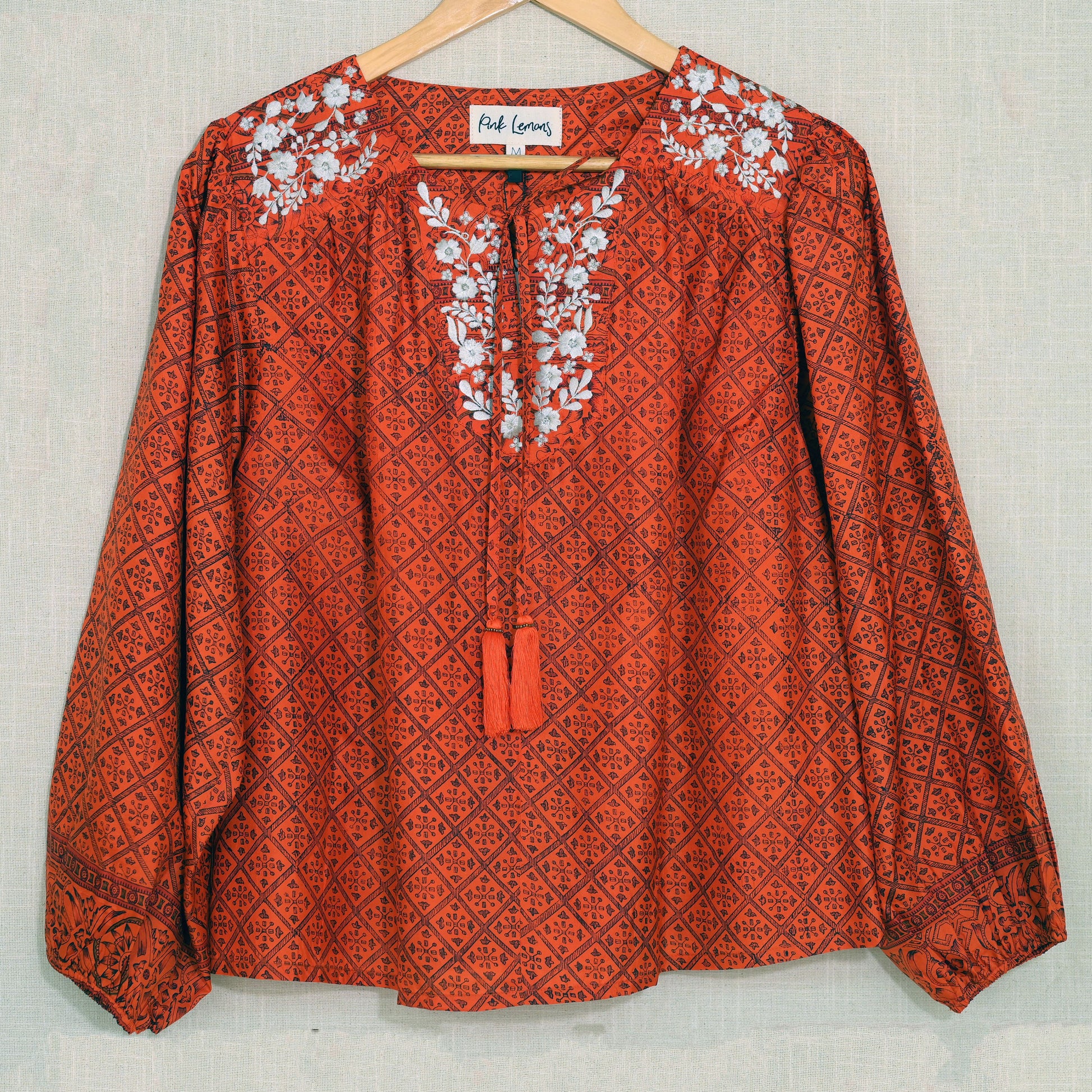 Lolita blouse has a loose breezy, feminine shape with puff shoulder detail and a front yoke with tassel ties. Lolita exudes charm and elegance with pretty embroidery detail on the shoulders and front yoke ,she looks great with jeans , linen pants and skirts /shorts alike , she can be dressed up or down to suit the occasion. It has a swing shape that can be worn loose or tucked in . Super versatile .