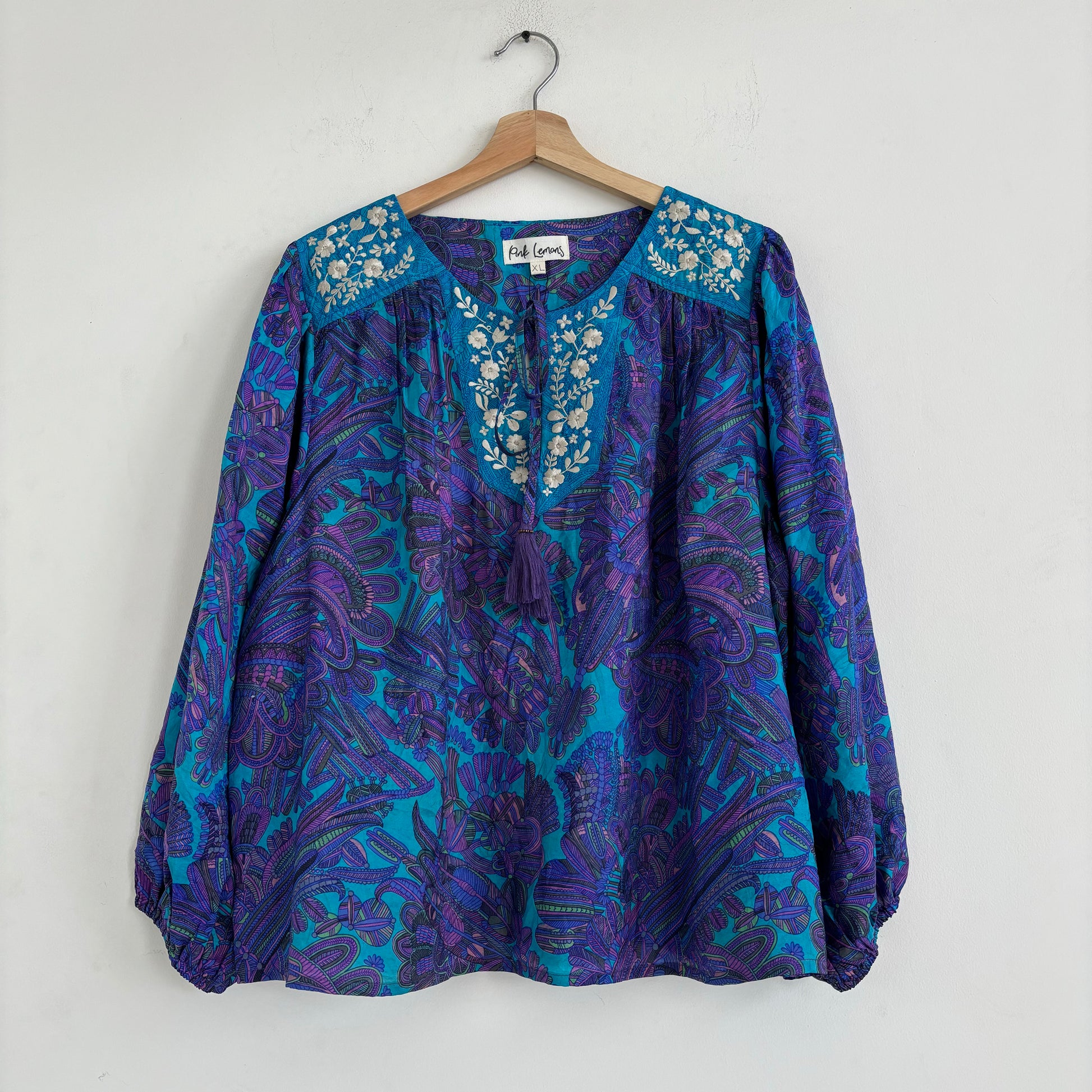 Lolita blouse has a loose breezy, feminine shape with puff shoulder detail and a front yoke with tassel ties. Lolita exudes charm and elegance with pretty embroidery detail on the shoulders and front yoke ,she looks great with jeans , linen pants and skirts /shorts alike , she can be dressed up or down to suit the occasion. It has a swing shape that can be worn loose or tucked in . Super versatile .