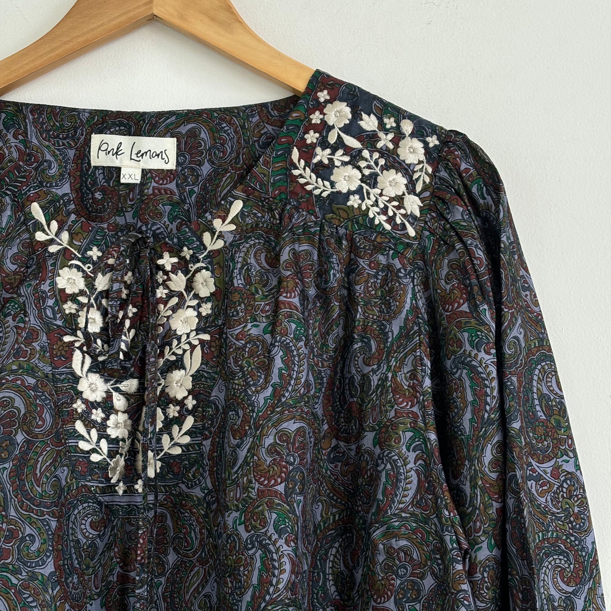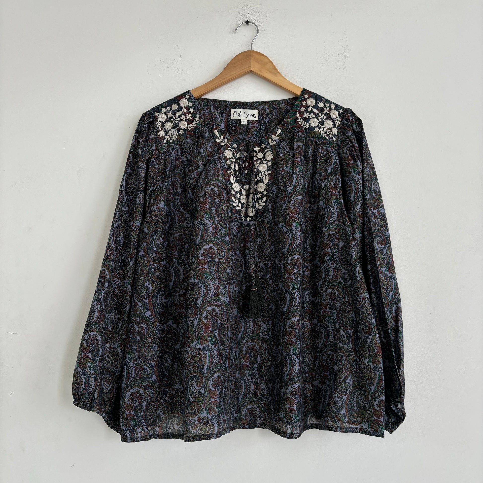 Lolita blouse has a loose breezy, feminine shape with puff shoulder detail and a front yoke with tassel ties. Lolita exudes charm and elegance with pretty embroidery detail on the shoulders and front yoke ,she looks great with jeans , linen pants and skirts /shorts alike , she can be dressed up or down to suit the occasion. It has a swing shape that can be worn loose or tucked in . Super versatile .