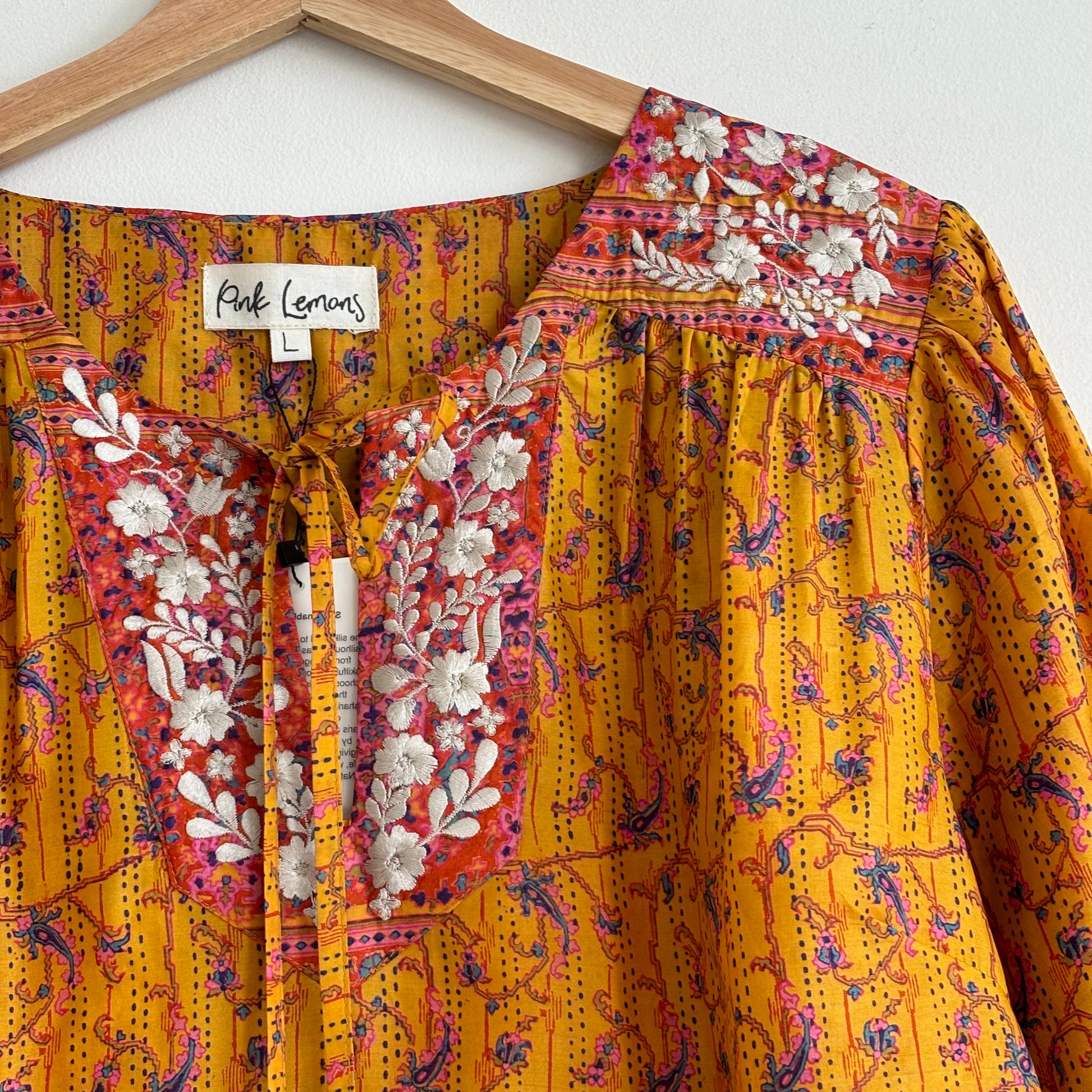 Lolita blouse has a loose breezy, feminine shape with puff shoulder detail and a front yoke with tassel ties. Lolita exudes charm and elegance with pretty embroidery detail on the shoulders and front yoke ,she looks great with jeans , linen pants and skirts /shorts alike , she can be dressed up or down to suit the occasion. It has a swing shape that can be worn loose or tucked in . Super versatile .