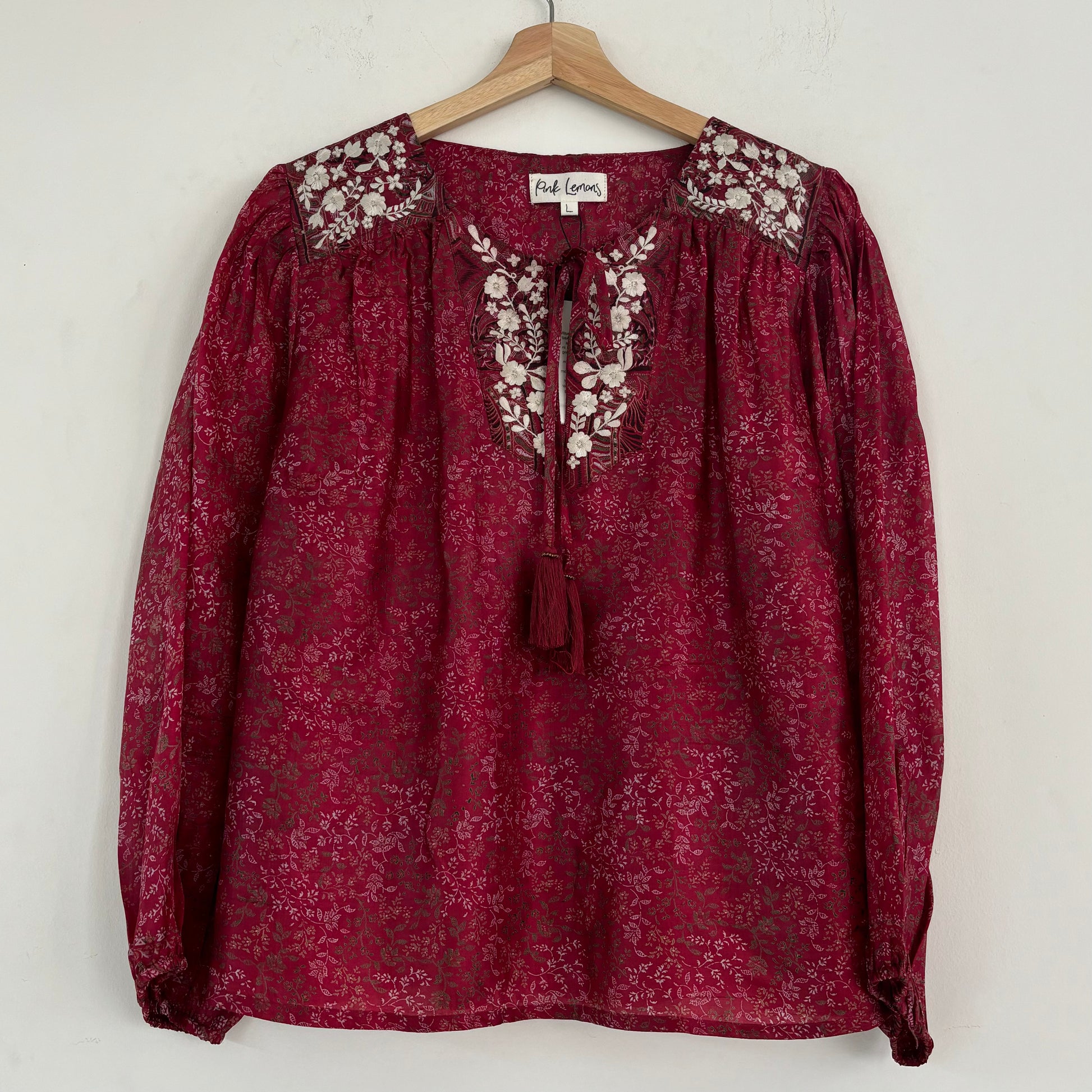 Lolita blouse has a loose breezy, feminine shape with puff shoulder detail and a front yoke with tassel ties. Lolita exudes charm and elegance with pretty embroidery detail on the shoulders and front yoke ,she looks great with jeans , linen pants and skirts /shorts alike , she can be dressed up or down to suit the occasion. It has a swing shape that can be worn loose or tucked in . Super versatile .