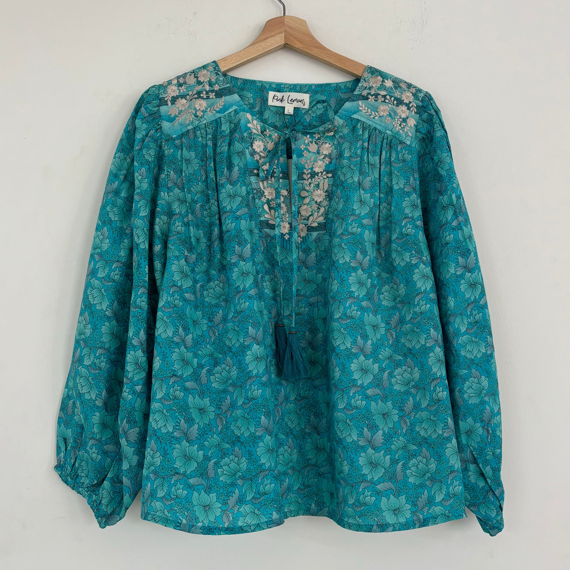 Lolita blouse has a loose breezy, feminine shape with puff shoulder detail and a front yoke with tassel ties. Lolita exudes charm and elegance with pretty embroidery detail on the shoulders and front yoke ,she looks great with jeans , linen pants and skirts /shorts alike , she can be dressed up or down to suit the occasion. It has a swing shape that can be worn loose or tucked in . Super versatile .