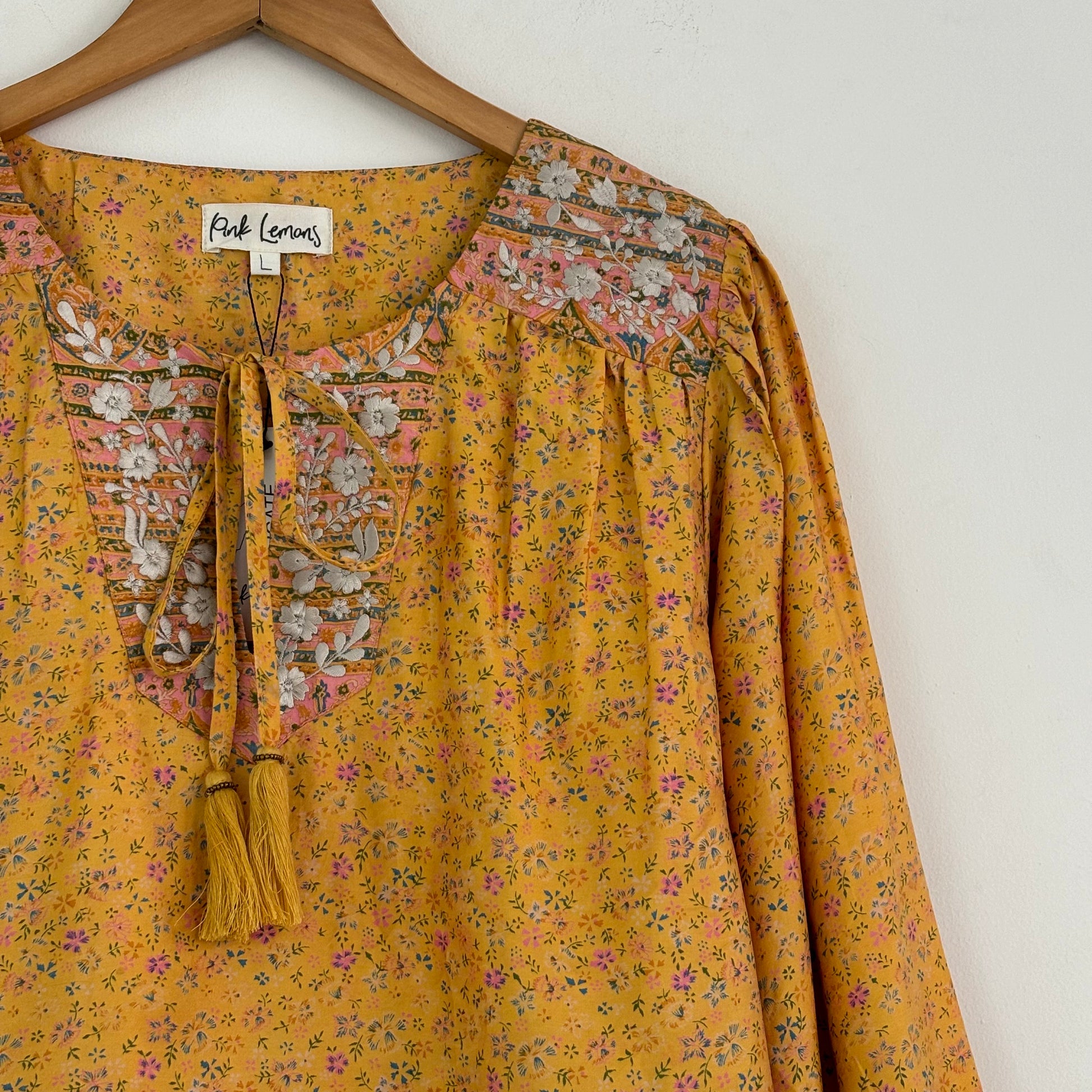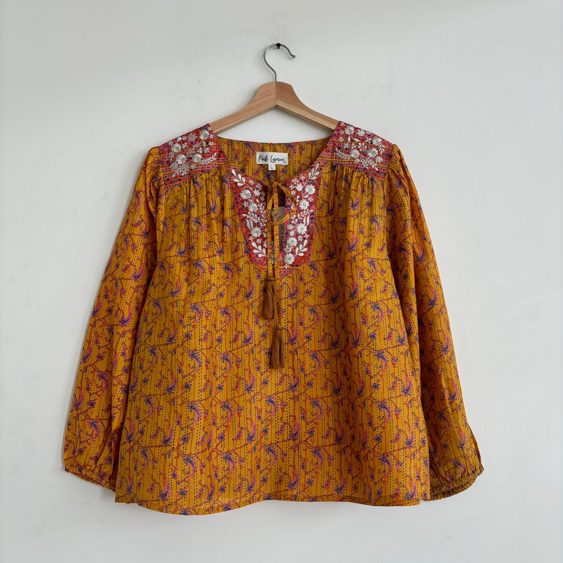 Lolita blouse has a loose breezy, feminine shape with puff shoulder detail and a front yoke with tassel ties. Lolita exudes charm and elegance with pretty embroidery detail on the shoulders and front yoke ,she looks great with jeans , linen pants and skirts /shorts alike , she can be dressed up or down to suit the occasion. It has a swing shape that can be worn loose or tucked in . Super versatile .