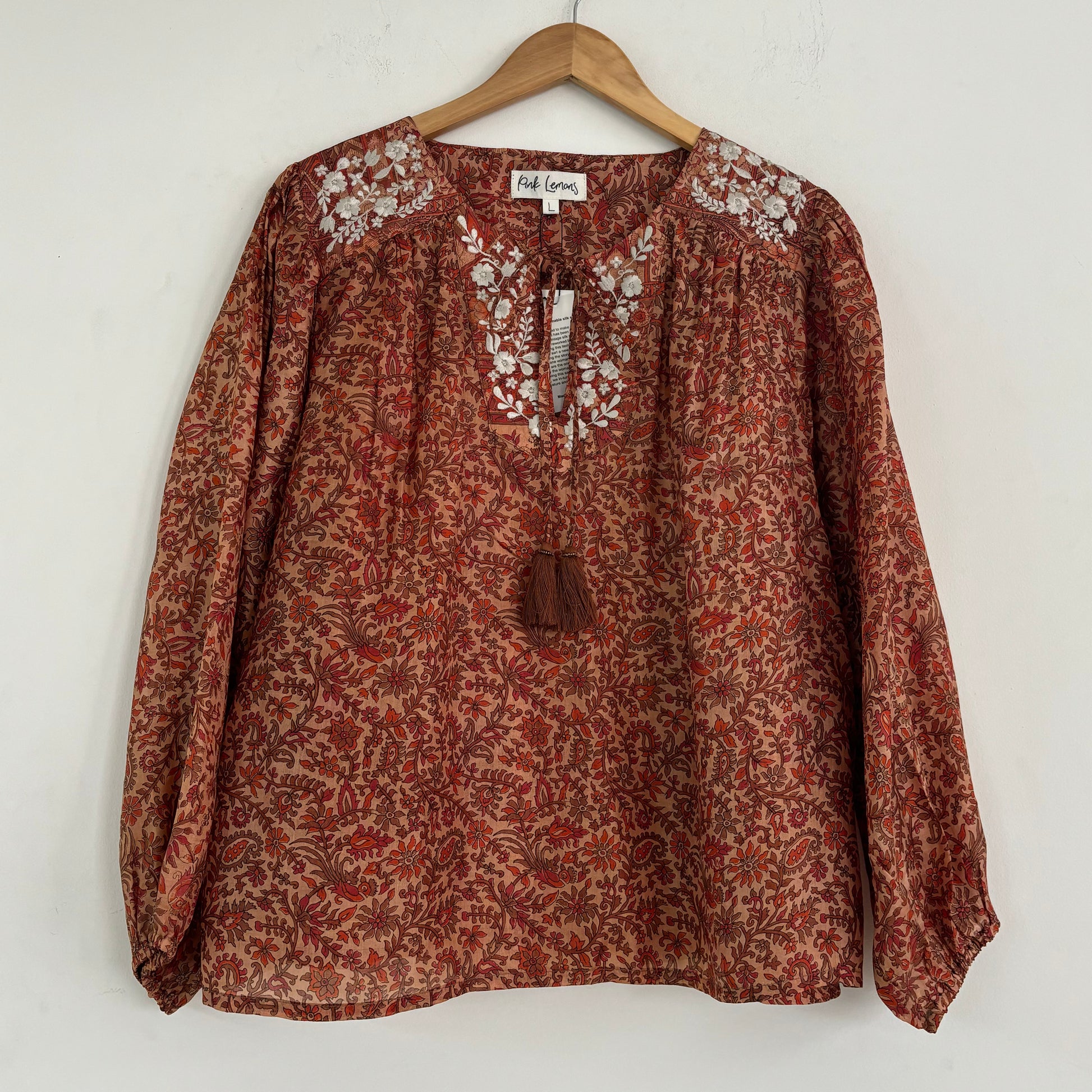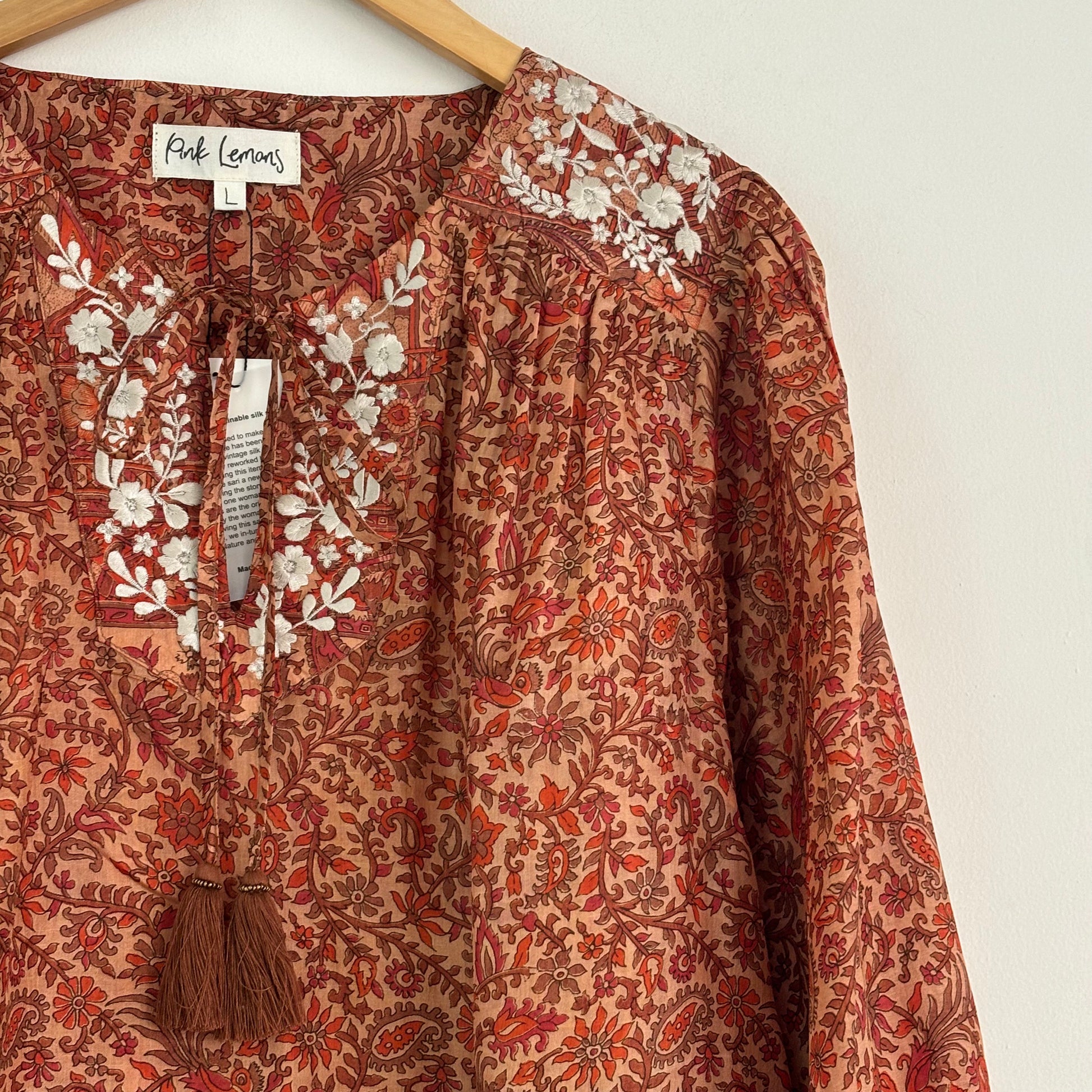 Lolita blouse has a loose breezy, feminine shape with puff shoulder detail and a front yoke with tassel ties. Lolita exudes charm and elegance with pretty embroidery detail on the shoulders and front yoke ,she looks great with jeans , linen pants and skirts /shorts alike , she can be dressed up or down to suit the occasion. It has a swing shape that can be worn loose or tucked in . Super versatile .