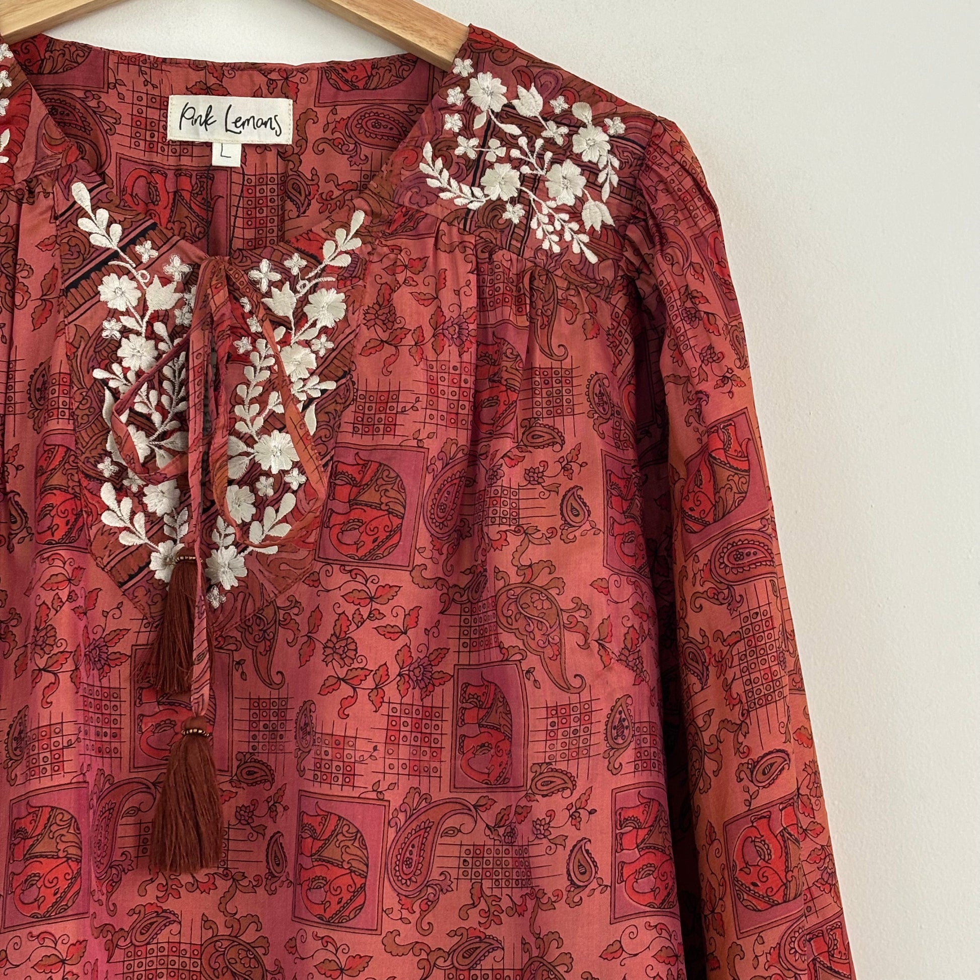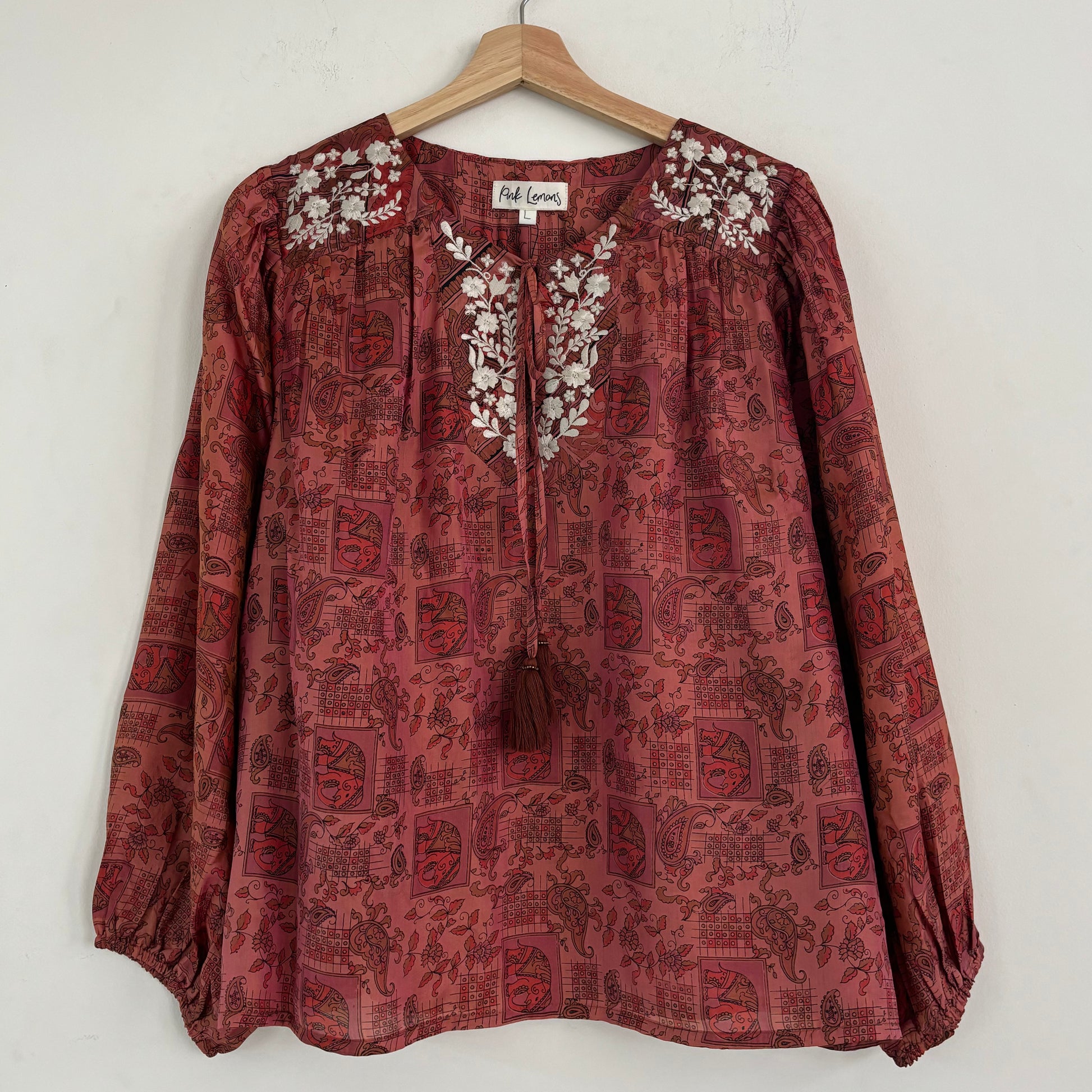 Lolita blouse has a loose breezy, feminine shape with puff shoulder detail and a front yoke with tassel ties. Lolita exudes charm and elegance with pretty embroidery detail on the shoulders and front yoke ,she looks great with jeans , linen pants and skirts /shorts alike , she can be dressed up or down to suit the occasion. It has a swing shape that can be worn loose or tucked in . Super versatile .