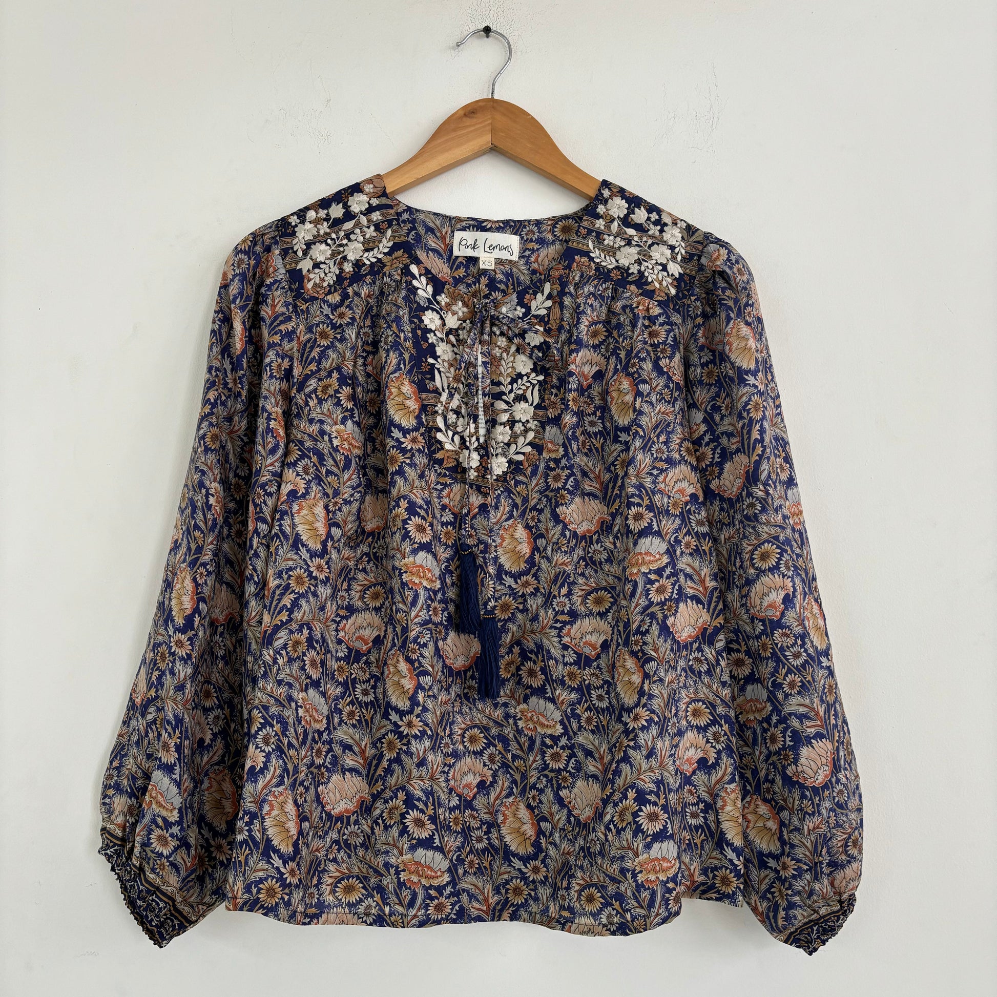 Lolita blouse has a loose breezy, feminine shape with puff shoulder detail and a front yoke with tassel ties. Lolita exudes charm and elegance with pretty embroidery detail on the shoulders and front yoke ,she looks great with jeans , linen pants and skirts /shorts alike , she can be dressed up or down to suit the occasion. It has a swing shape that can be worn loose or tucked in . Super versatile .